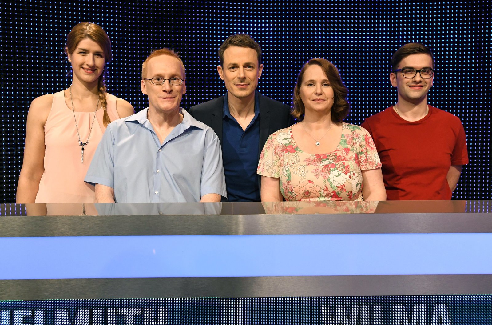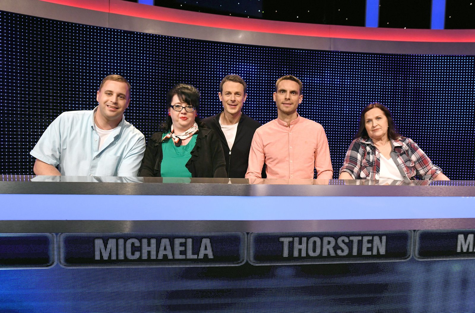 Folge 336Moderator Alexander Bommes (M.) mit den Kandidaten Fatima Azmani (l.), Christoph Schaal-Breite (3.v.r.), Sehri Schmidt (2.v.r.) und Johannes Meyer (r.).Bild: © ARD/Uwe Ernst