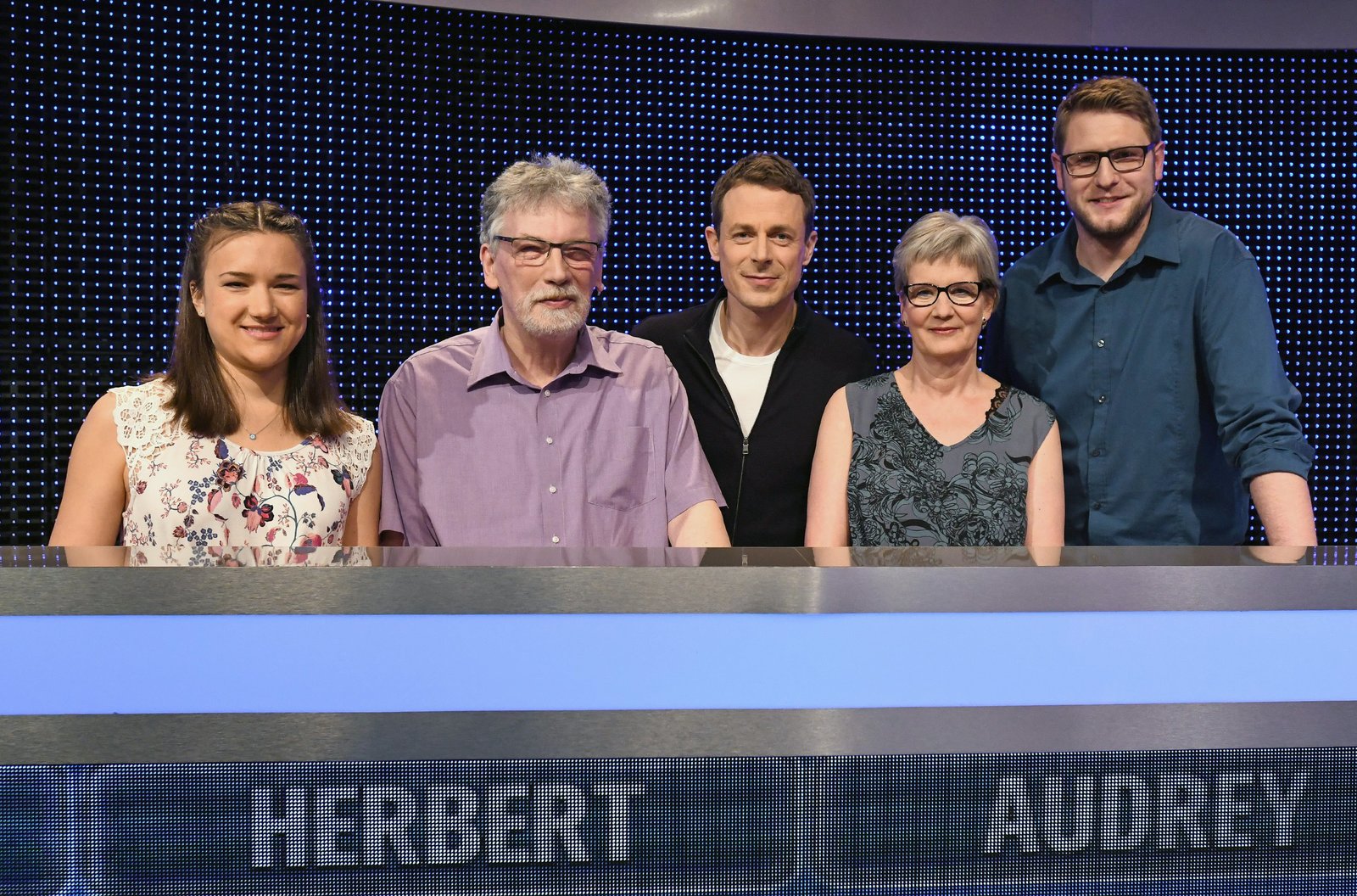 Moderator Alexander Bommes (M.) mit den Kandidaten (v.l.n.r.): Linda Schock, Herbert Garisch, Audrey Rodtgard und René Herklotz.Bild: © ARD/Uwe Ernst