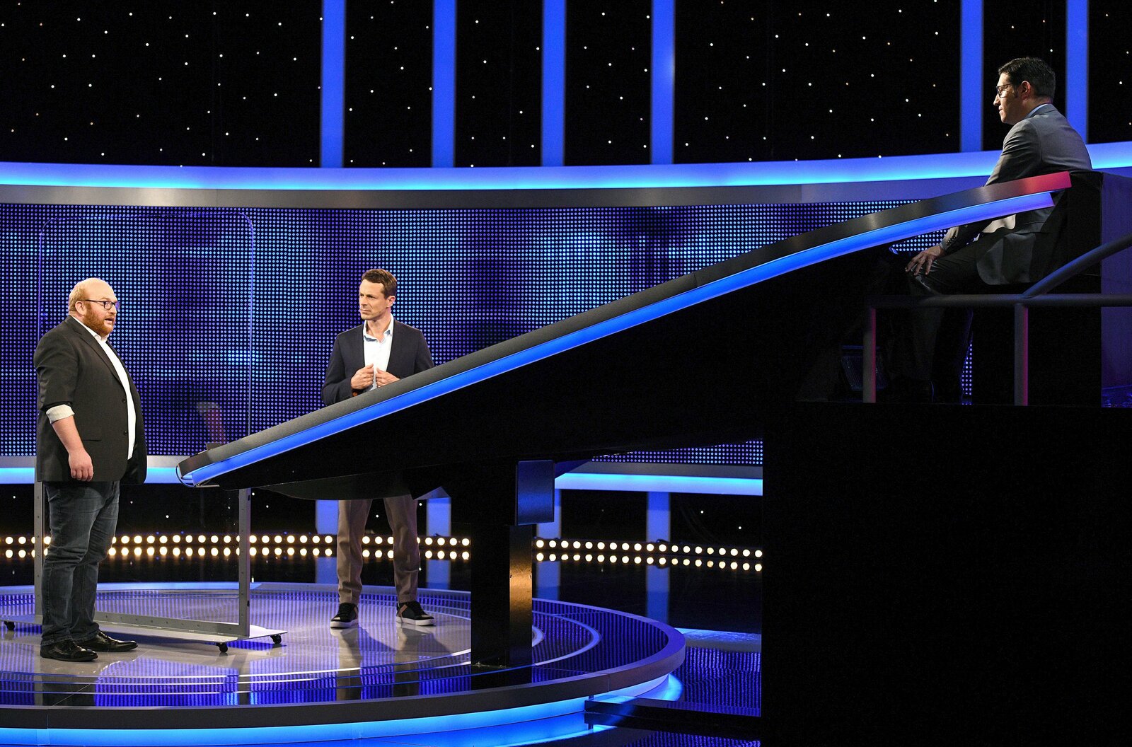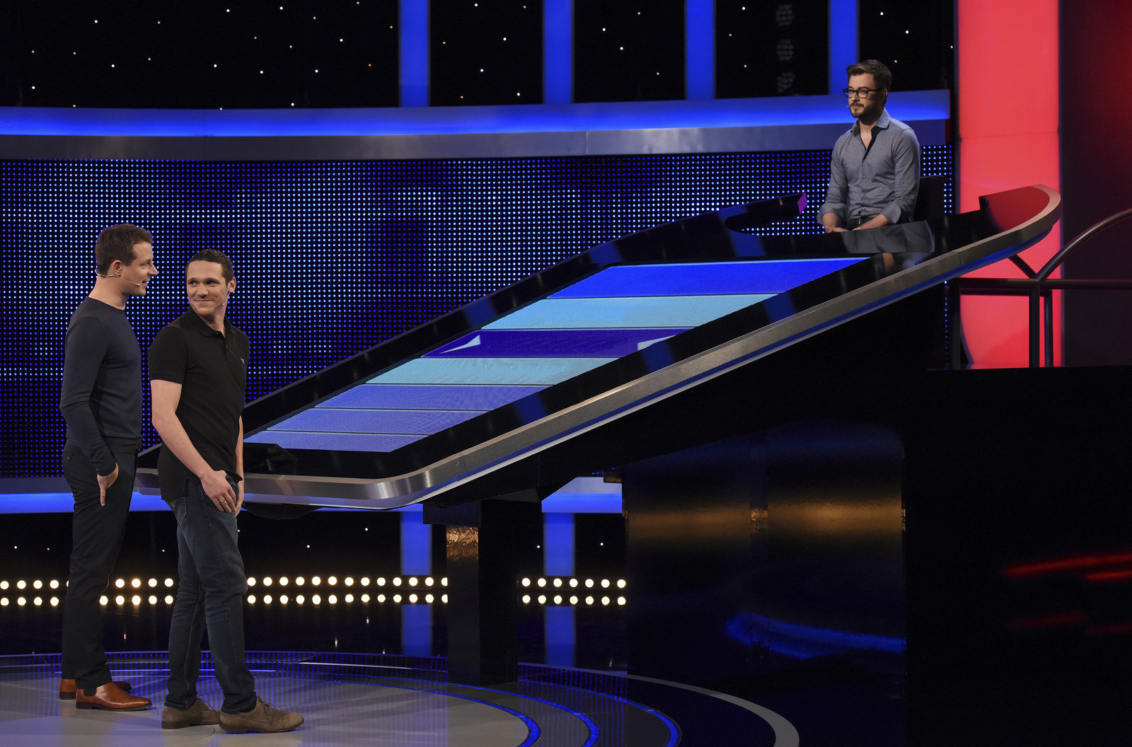 Folge 454Moderator Alexander Bommes (M.) mit dem Kandidaten Jan Porwitzki (l.) und dem Jäger: Sebastian Jacoby (r.). SPERRVERMERK:Bild: © ARD/Uwe Ernst