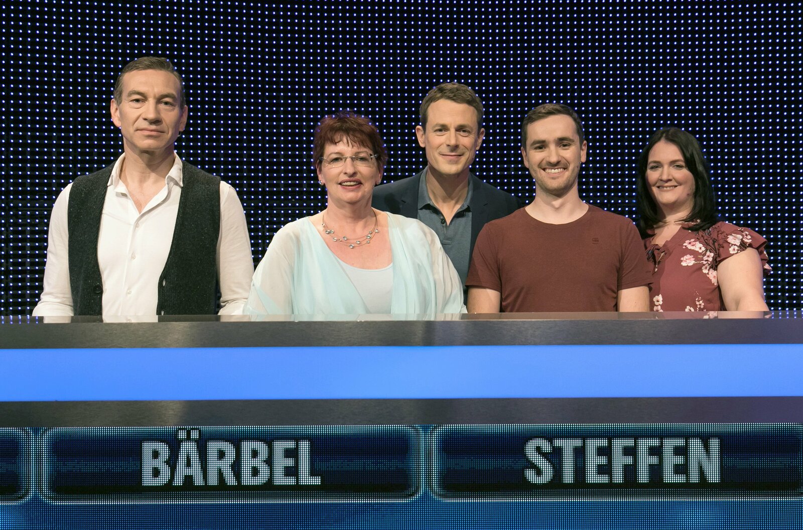 Folge 346Moderator Alexander Bommes (M.) mit den Kandidaten (v.l.n.r.): Dietmar Dublasky, Bärbel Ralf, Steffen Boettcher und Denise Durand.Bild: © ARD/Lisa Krechting