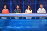 Folge 398Moderator Alexander Bommes (M.) mit den Kandidaten (v.l.n.r.): Mark Geberth-Hindermeyer, Michaela Hoppe Thorsten Claus und Maria Hahn.Bild: © ARD/Uwe Ernst
