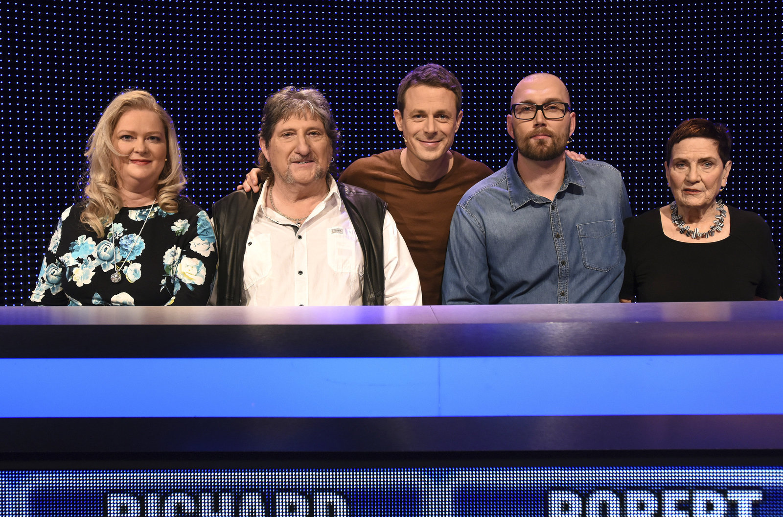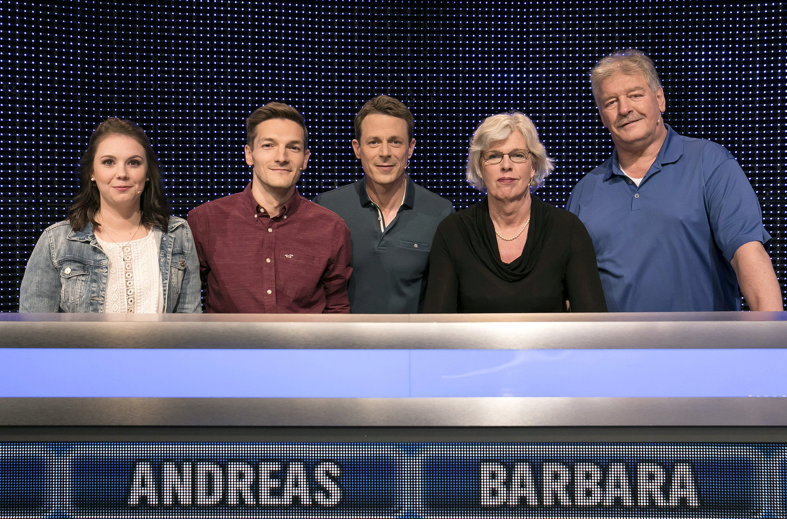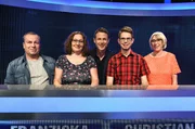 Folge 212Moderator Alexander Bommes (M.) mit den Kandidaten (v.l.n.r.): Gerti Stegmann, Thomas Mehlbeer, Martina Druckenthaner, Jan Eric Schnellbacher.Bild: © ARD/Uwe Ernst