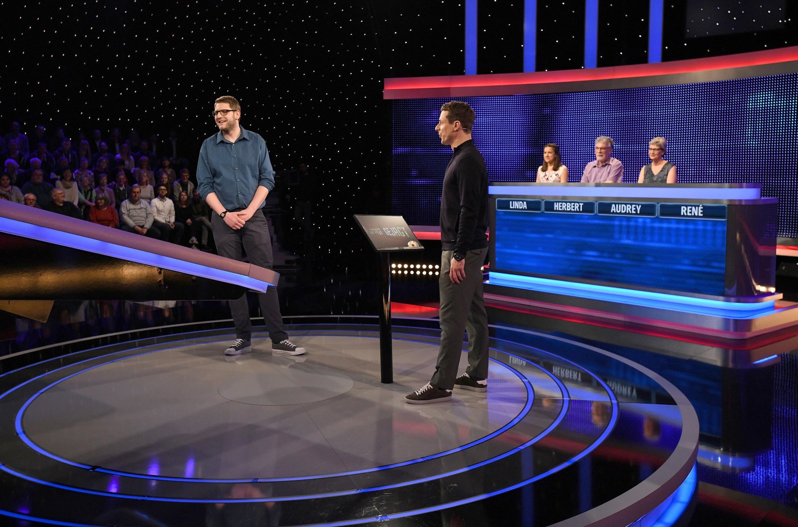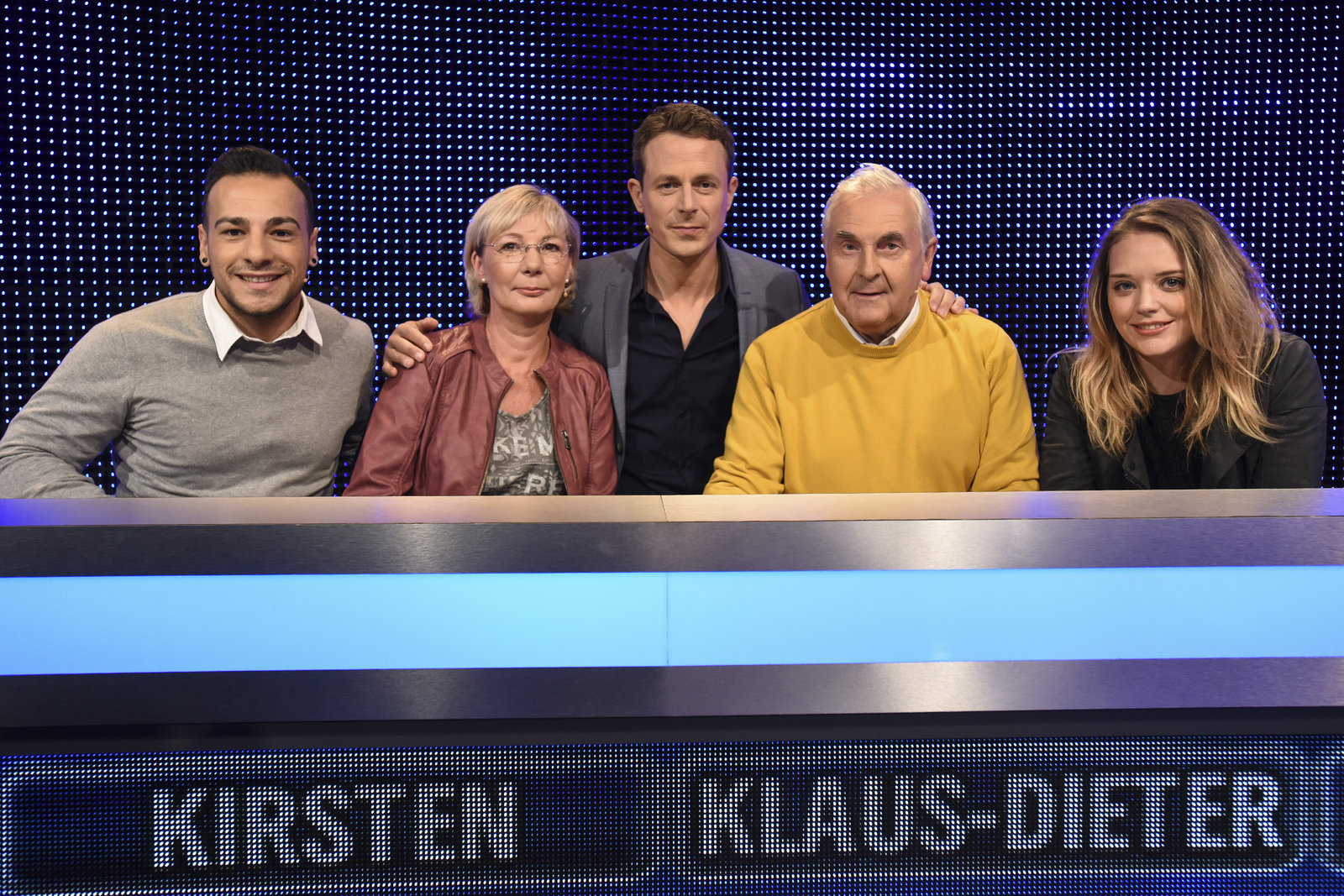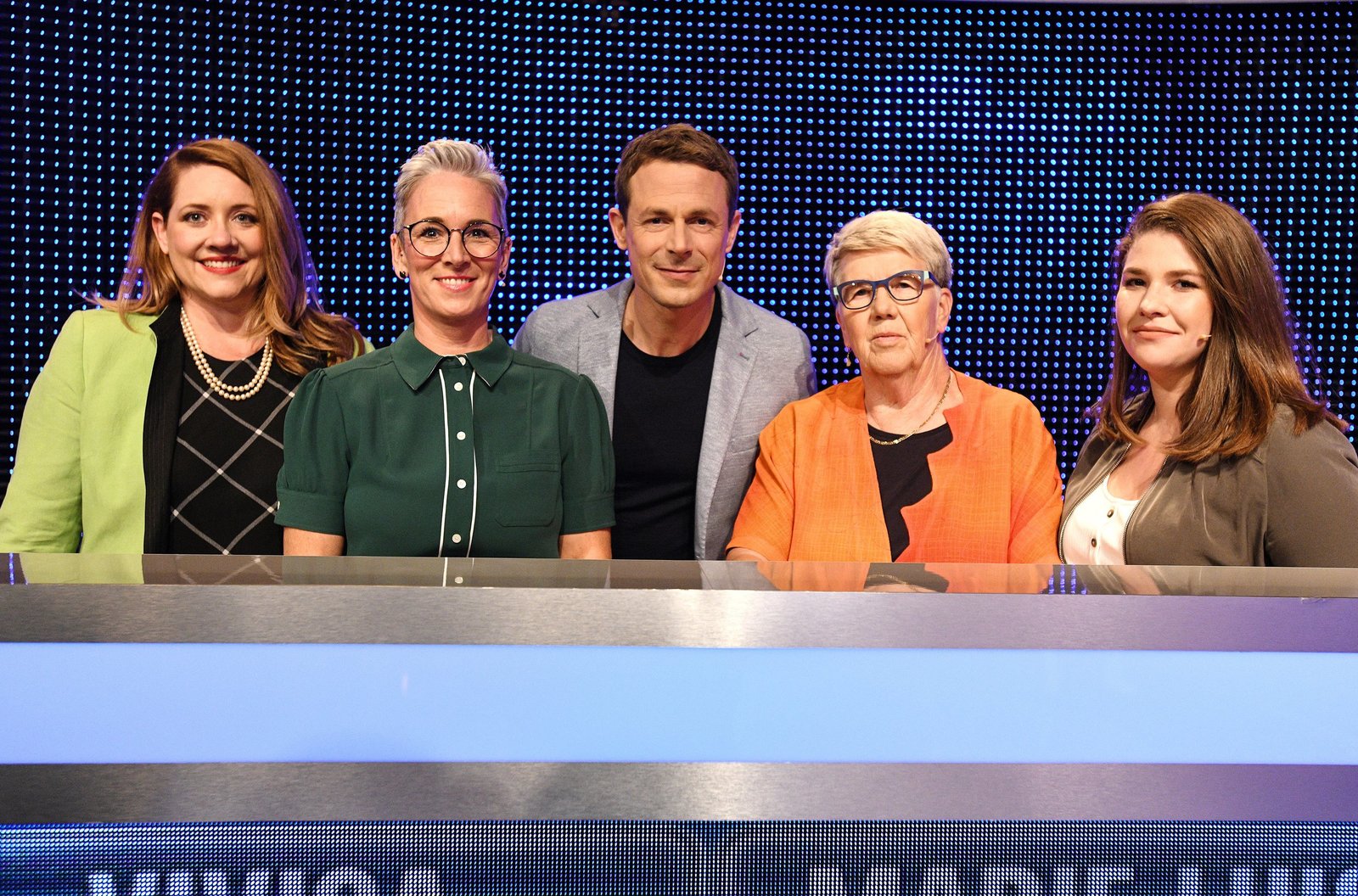 Moderator Alexander Bommes (M.) mit den Kandidaten René Herklotz (l.), Linda Schock (3.v.r.), Herbert Garisch (2.v.r.) und Audrey Rodtgard (r.).Bild: © ARD/Uwe Ernst