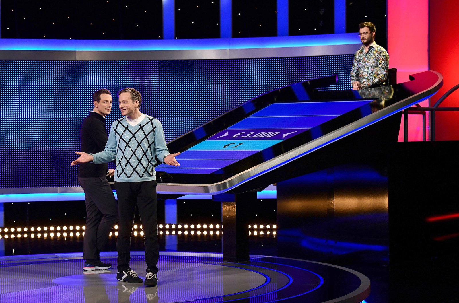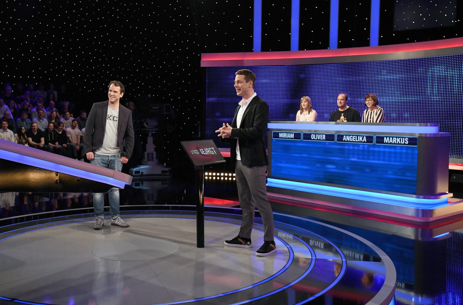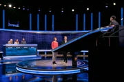 Folge 327In "Gefragt - Gejagt" tritt ein Team von vier Kandidatinnen und Kandidaten gegen ein Superhirn, den "Jäger" an. Wenn die Kandidaten gegen den Jäger gewinnen, retten sie sich und ihr Geld ins Finale. Keine leichte Aufgabe, denn die Jäger sind ausgewiesene Quizprofis. - Foto: Moderator Alexander Bommes (l.) mit dem Kandidaten Daniel Bauer (2.v.l.) und dem Jäger Sebastian Klussmann (r.).Bild: © rbb/ARD/Uwe Ernst