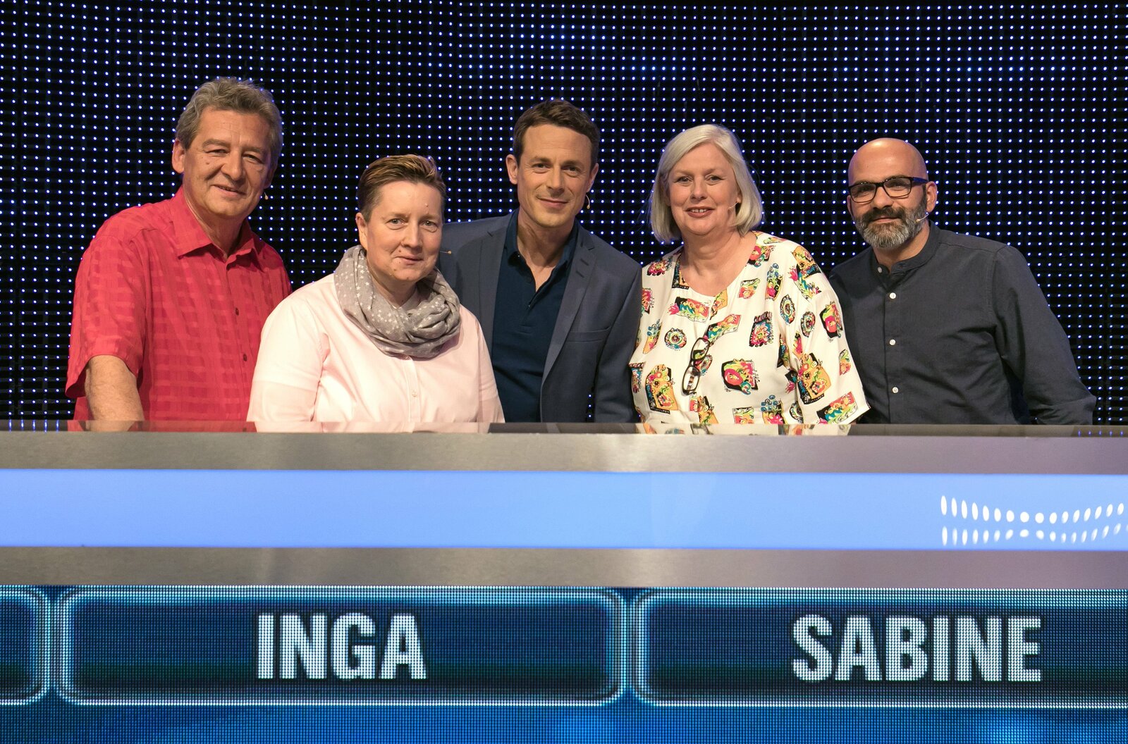 Folge 363Moderator Alexander Bommes (M.) mit den Kandidaten Pascal Schuster (l.), Nicolle Hofmann (3.v.r.), Ulrich Börder (2.v.r.) und Bianca Eifert-Koch (r.).Bild: © ARD/Uwe Ernst