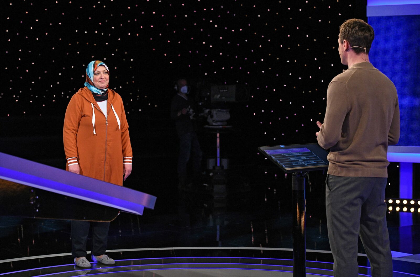 Moderator Alexander Bommes (r.) mit der Kandidatin Zübeyda Cadiroglu (l.).Bild: © ARD/Uwe Ernst