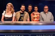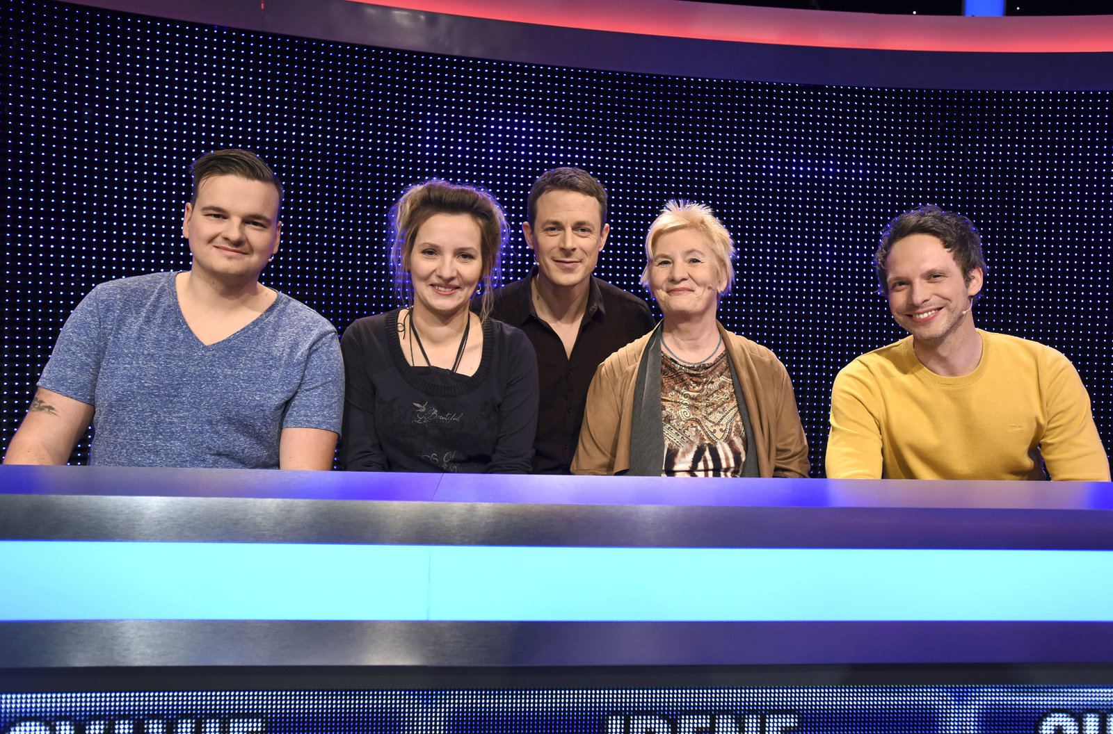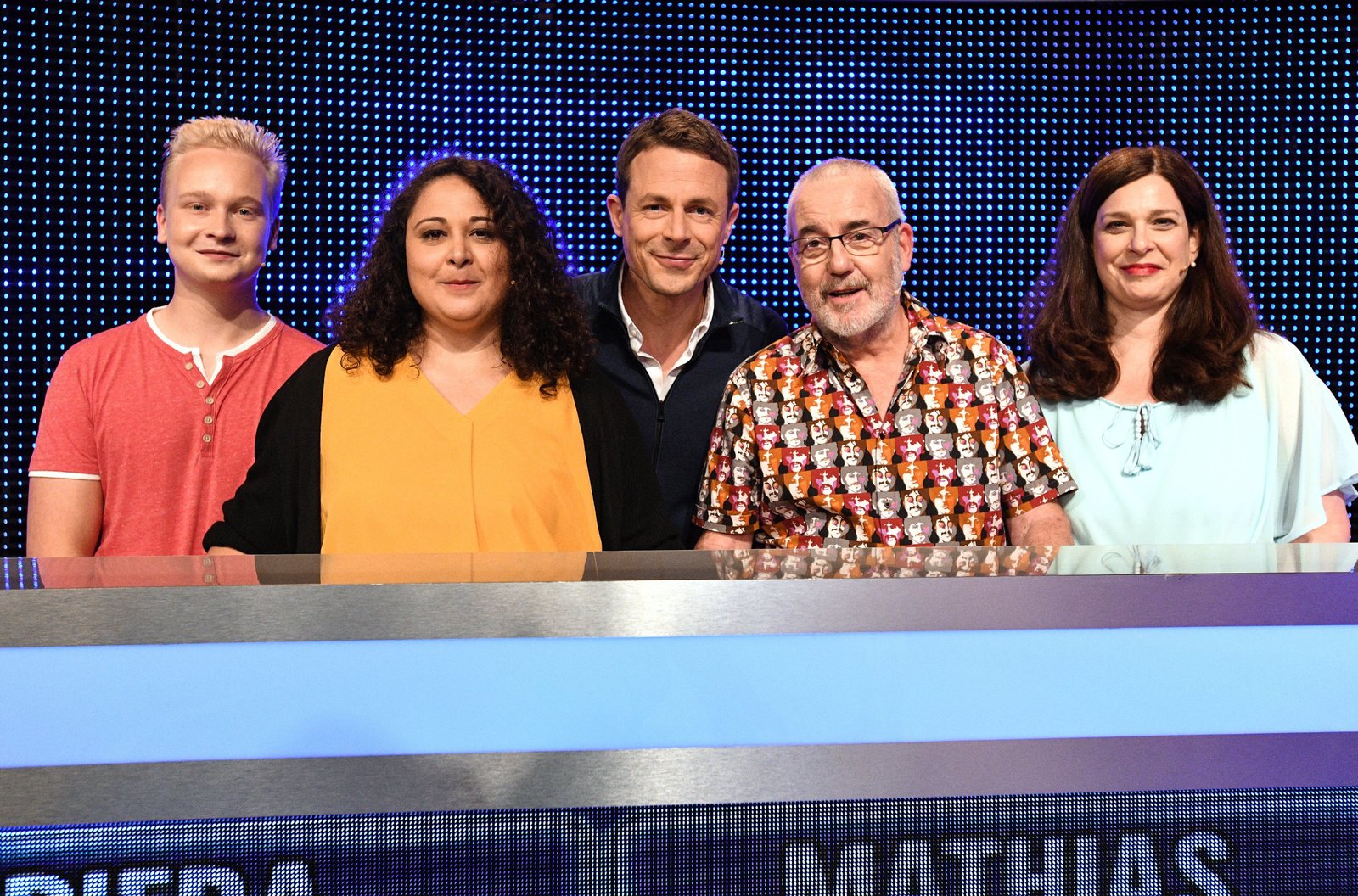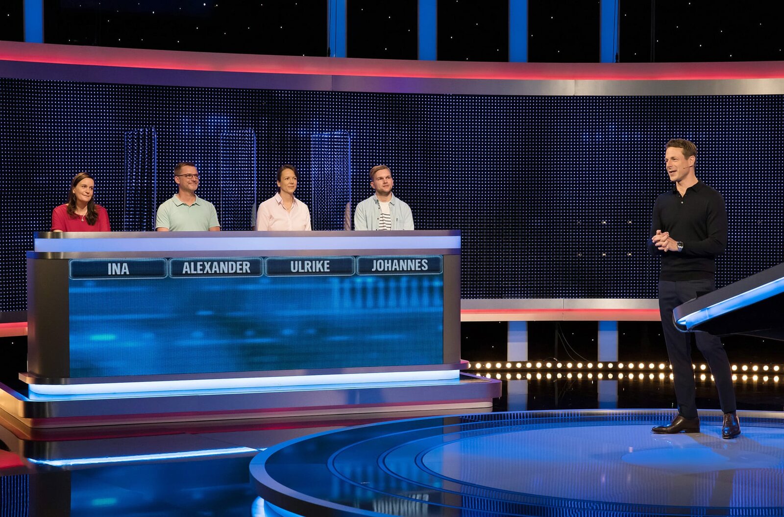 Folge 348Moderator Alexander Bommes (M.) mit den Kandidaten Josip Kolobaric (l.), Astrid Spiegel (3.v.r.), Johannes Schepelmann (2.v.r.) und Natascha Wittig (r.).Bild: © ARD/Uwe Ernst