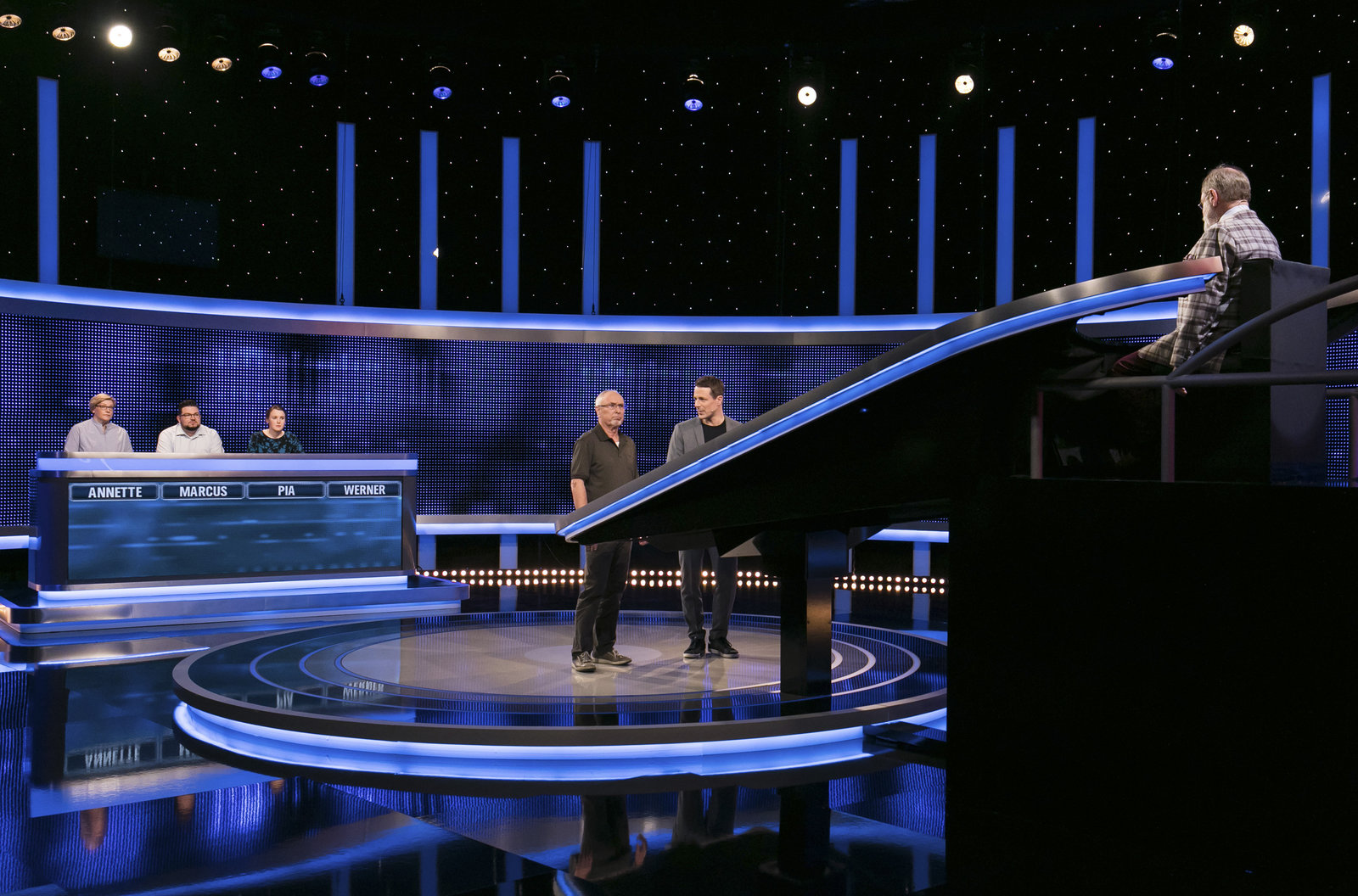 Folge 285Moderator Alexander Bommes (M.) mit den Kandidaten (v.l.n.r.): Melanie Freitag, Andreas Godehardt, Mareike Nissen und Christoph Klasen.Bild: © ARD/Uwe Ernst