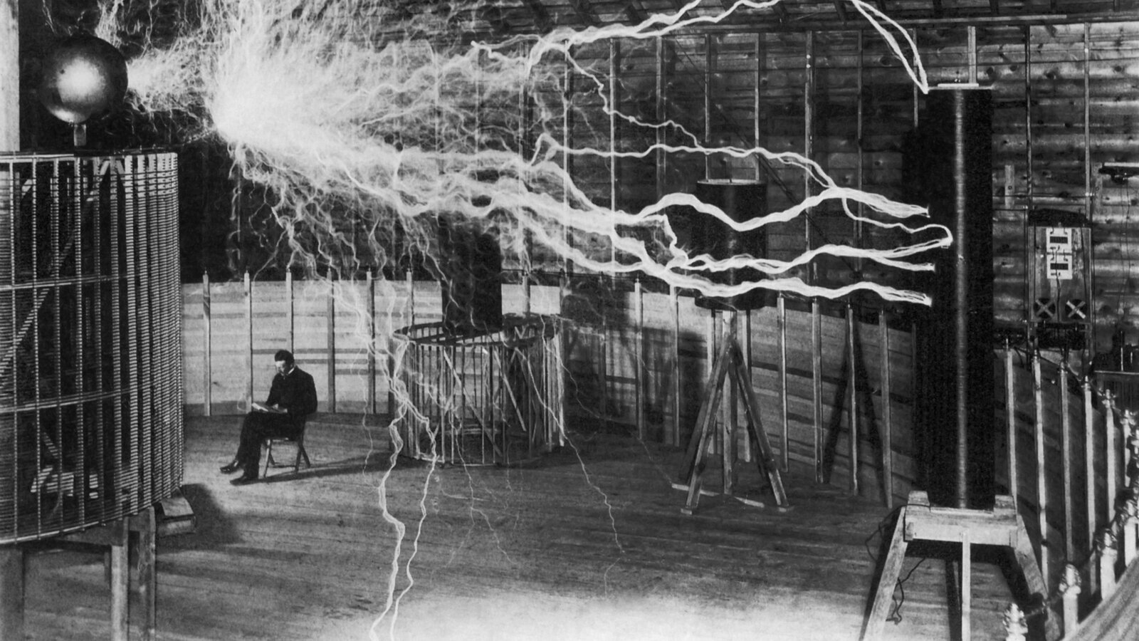 Das SpecialInventor and scientist Nikola Tesla in his lab while his magnifying transmitter high voltage generator produces bolts of electricity. December 1899.Bild: © John Parrot / Stocktrek Images / Getty Images / This content is subject to copyright.