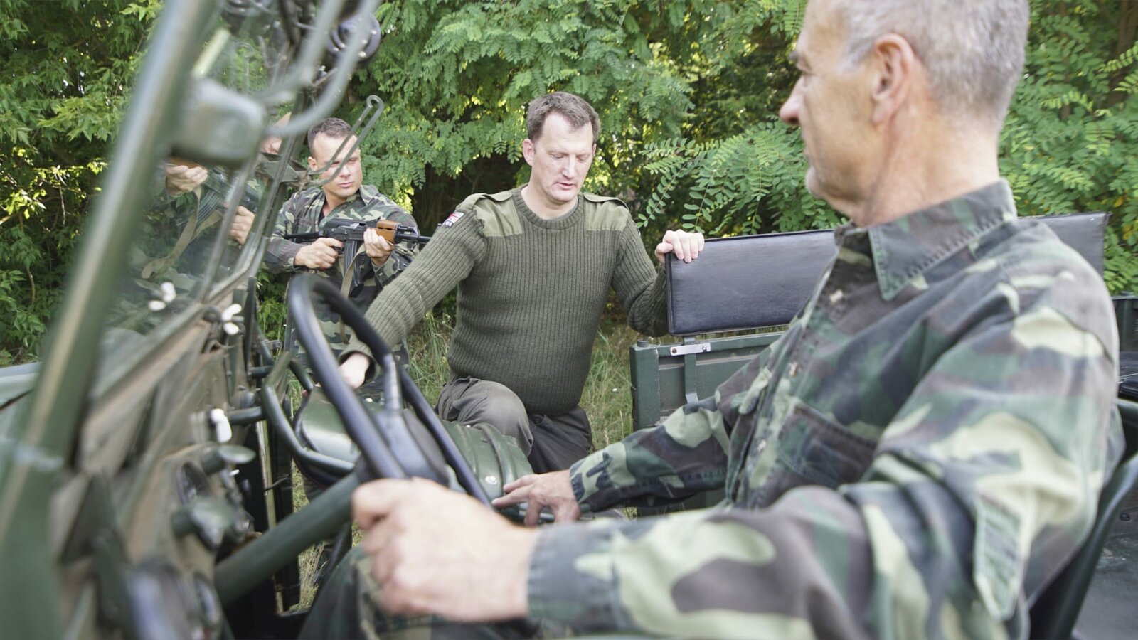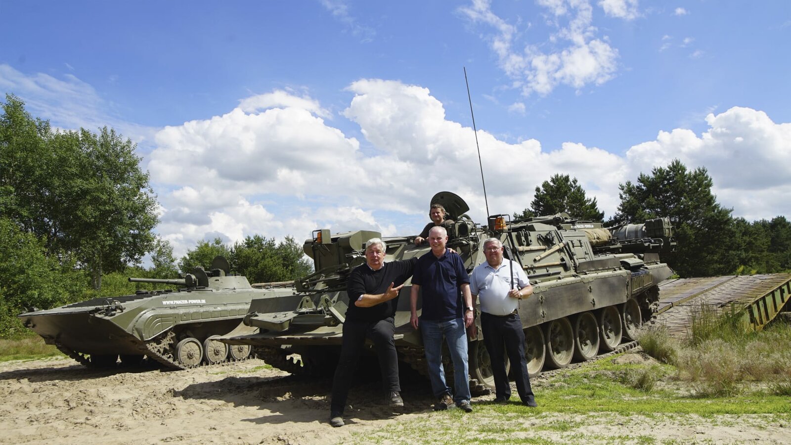 Einsatz hinter dem Eisernen VorhangNigel Dunkley, Lawrence G. Kelley und Jean-Paul Staub vor einem ehemaligen NVA-Bergepanzer, Drehpause in der ehemaligen Sowjet-Kaserne in Mahlwinkel.Bild: © ZDF und Jarek Presnück