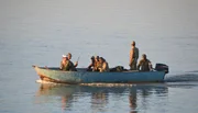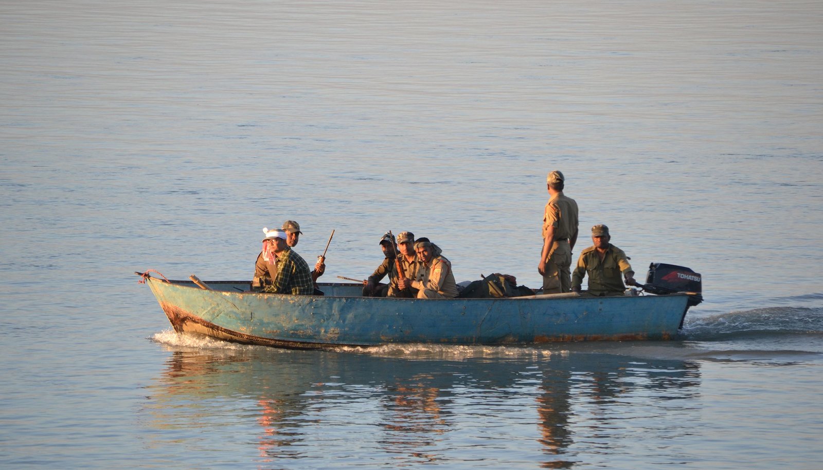 Indiens Reich der großen TiereWaldschützer auf einem Patrouillenboot auf dem Brahmaputra-Fluss.Bild: © NDR/Eikon Media/Ruth Berry