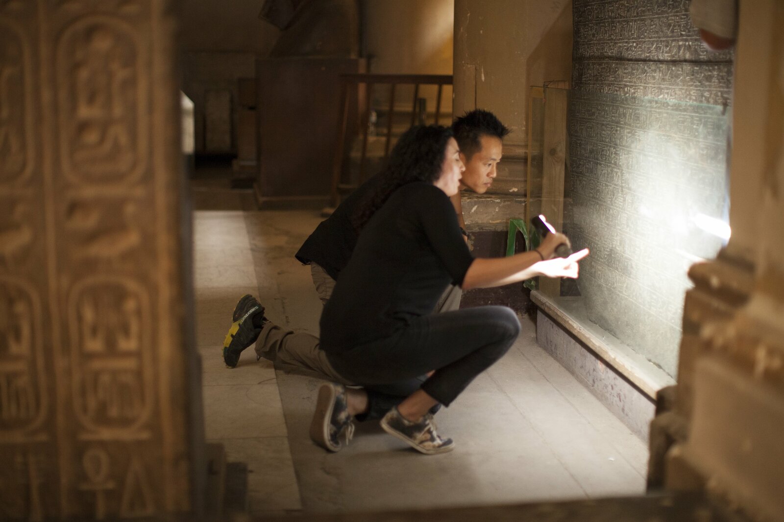 Teilung des Roten MeeresCairo, Egypt - (Left to right) Dr Meredith Brand and Albert Lin inspect the Merneptah Stele at the Egyptian Museum, Cairo. (National Geographic)Bild: © Copyright © The National Geographic Channel.