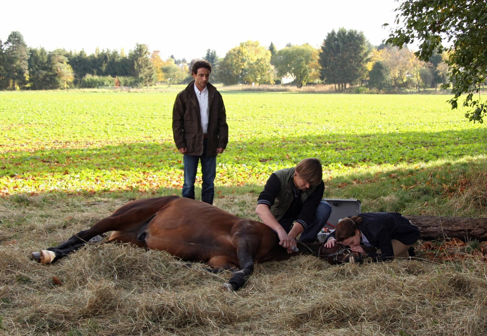 Aufs Kreuz gelegtARD GELD.MACHT.LIEBE, Folge 11, AUFS KREUZ GELEGT, Deutschland 2009, Regie Christine Kabisch, am Donnerstag (04.08.11) um 02:20 Uhr im Ersten. Martine (Gunther Gillian, links) muss zusehen, wie Elena (Jana Klinge, rechts) ihr geliebtes Pferd einschläfern lässt.Bild: © "ARD Degeto/ARD Degeto/T