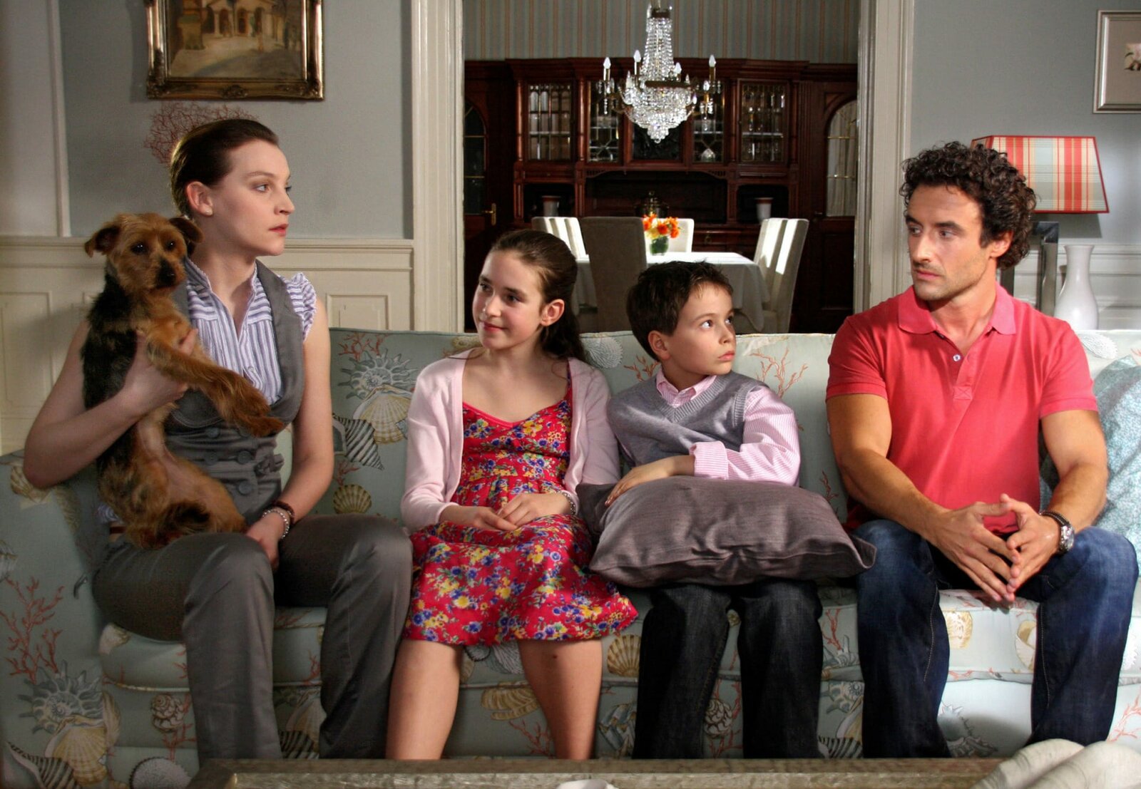 Kuckuckseirbb Fernsehen GELD.MACHT.LIEBE, "Kuckucksei", am Samstag (06.07.13) um 15:30 Uhr. Martine La Rocca (Gunther Gillian, 2. v. links) mit seiner Frau Elena (Jana Klinge, rechts) und ihren Kindern Cinzia (Elena von Eysmondt) und Carlos (Luca Jochen).Bild: © rbb/Degeto/Tivoli Film/Thorsten