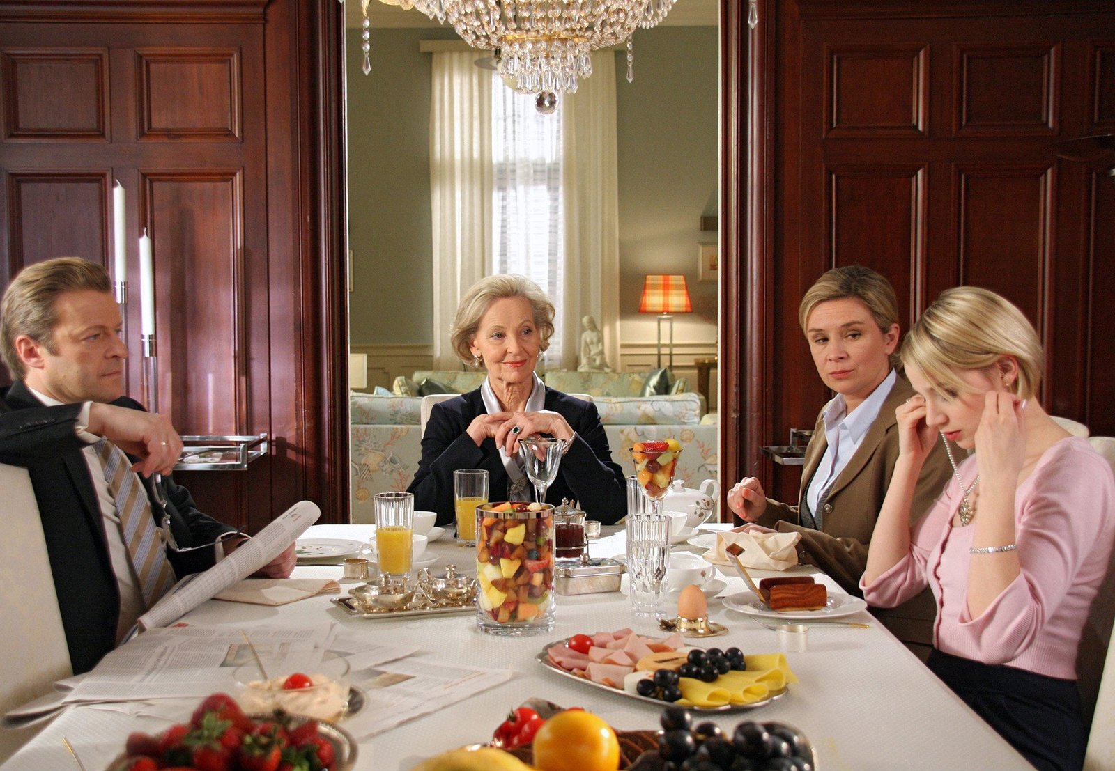 Höhenflughr-fernsehen GELD.MACHT.LIEBE Folge 12, Höhenflug, 19-teilige Fernsehserie, Deutschland 2009, Regie: Helmut Metzger, am Donnerstag (17.02.11) um 00:00 Uhr. Markus (Roland Koch) sitzt mit seiner Mutter Lilo (Gerlinde Locker), seiner Frau Sophia (Susanne Schäfer, 2.v. rechts) und Tocher Marietta (Jytte-Merle Böhrnsen) beim Frühstück.Bild: © "Bild: HR/Degeto/Tivoli Film/Daniel