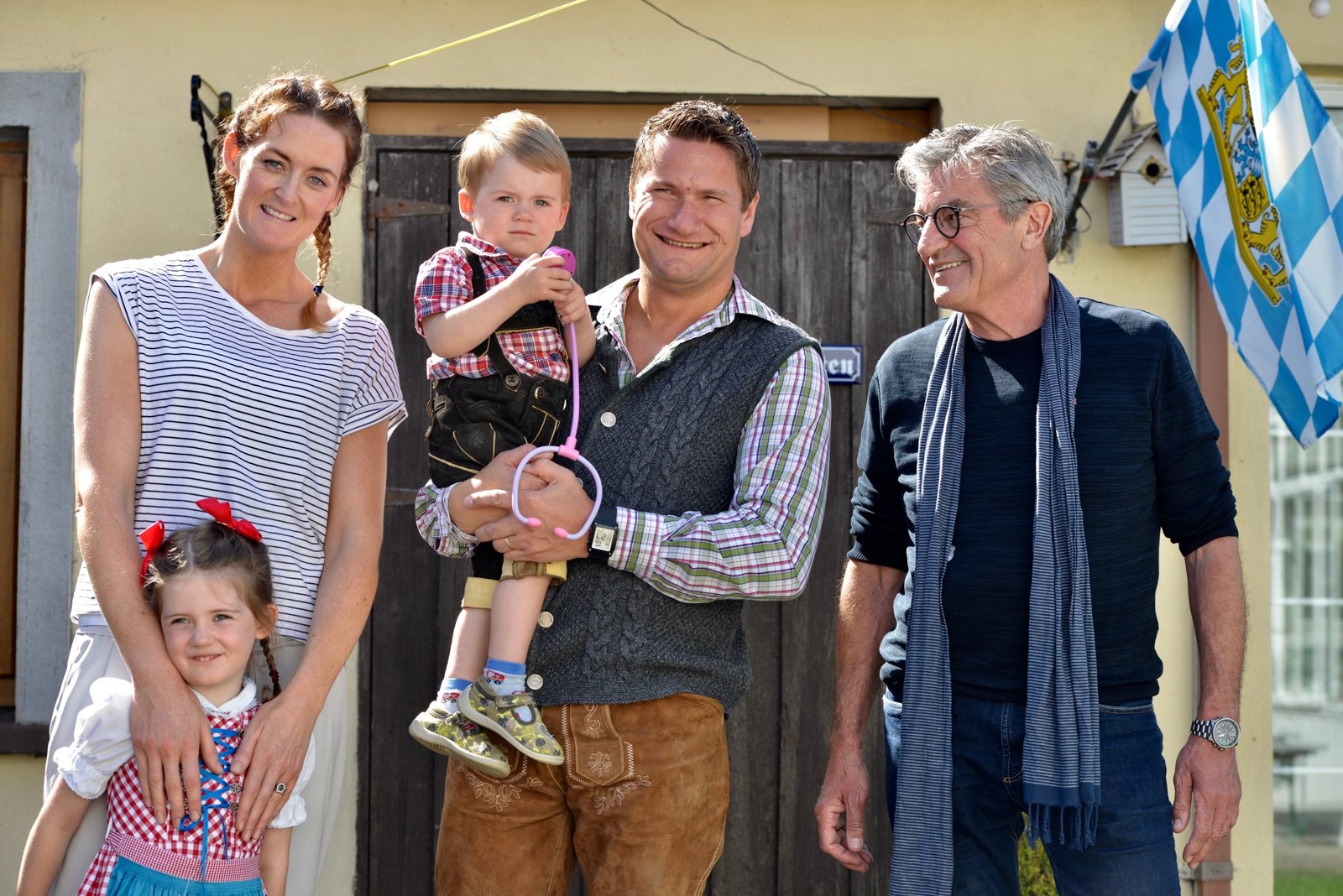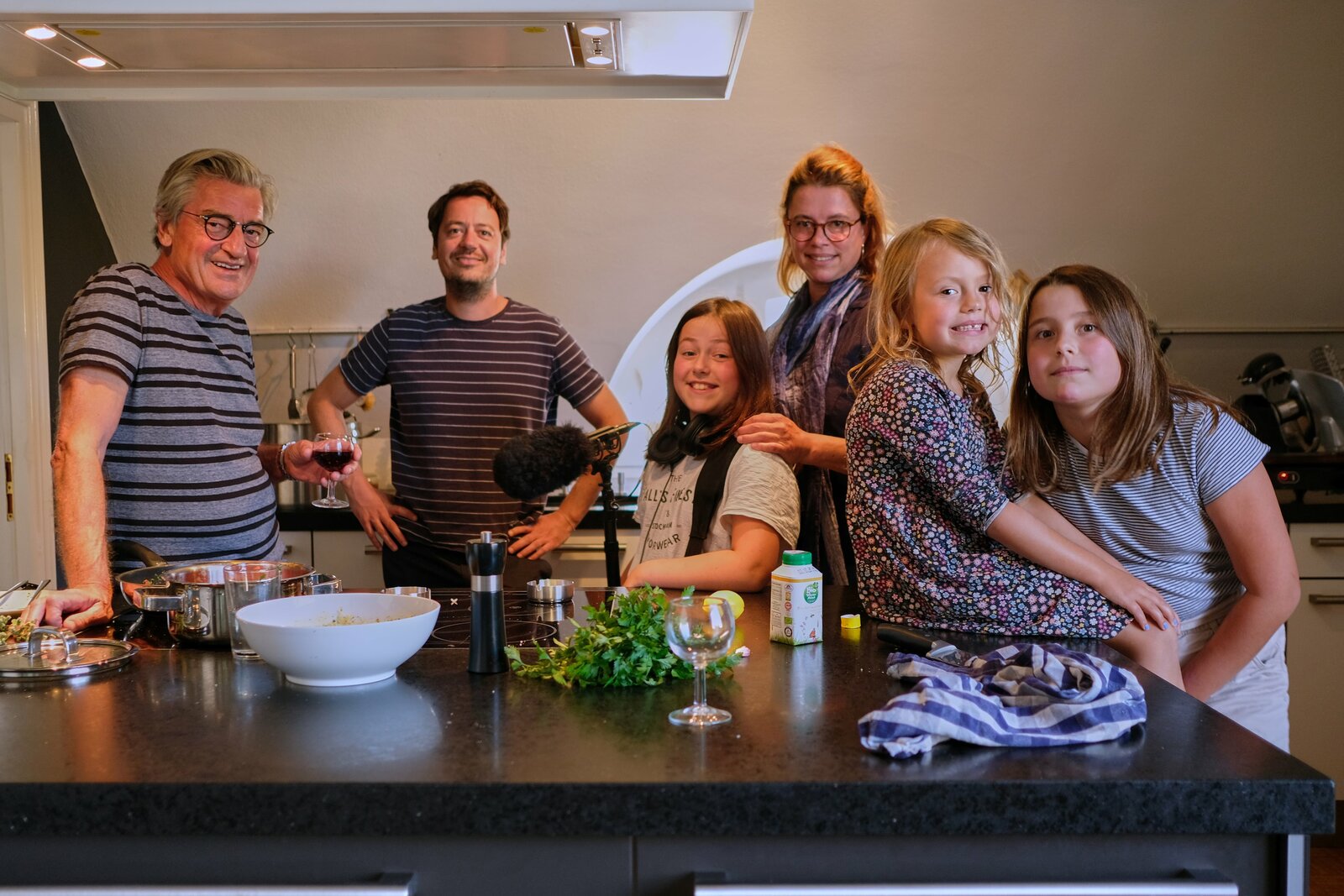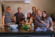 Von links: Franz und Jonas Gernstl, Mathilda, Uli, Amalia und Greta Kerschbaumer. Familie Kerschbaumer besucht Franz und Jonas zum Abendessen.Bild: © BR/megaherz gmbh/Hans-Peter Fischer