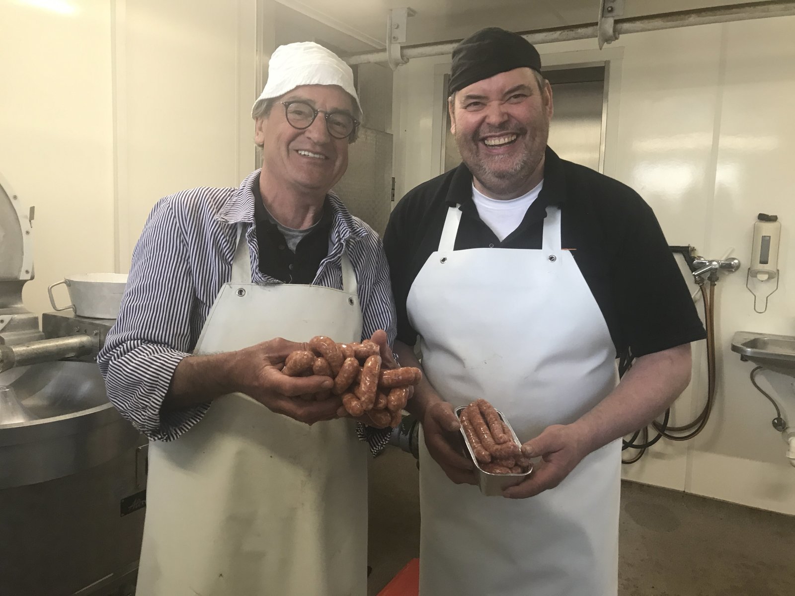 Franz Gernstl hat zusammen mit Metzger Martin Burmann (rechts) aus Pfaffenhofen bei Roth etwas Neues kreiert: Gernstl’s Brotbratwurst mit Brotgewürzen.Bild: © BR/megaherz gmbh
