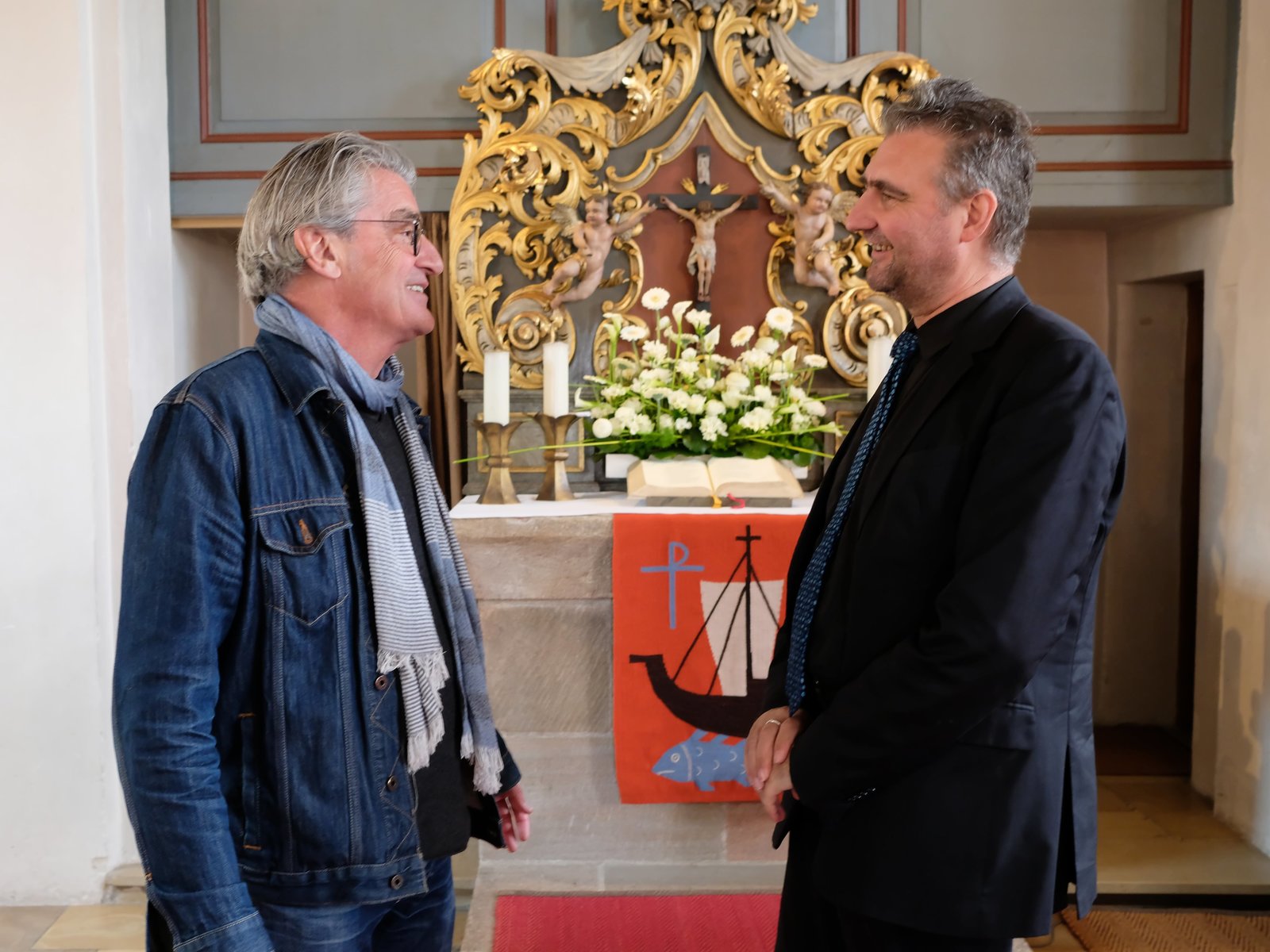 in der Dreifaltigkeitskirche in Roth. Der evangelische Pfarrer Bernhard Nikitka (rechts) gilt als besonders mitreißender Prediger.Bild: © BR/megaherz gmbh
