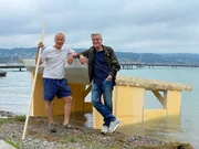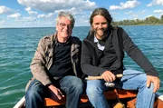 Ein verwegener Plan: Torsten Schnebel will mit einem selbstgebauten Hausboot von Zürich nach Marseille fahren. Rechts: Franz Xaver Gernstl.Bild: © HP Fischer / BR, megaherz gmbh / BR/megaherz gmbh/HP Fischer