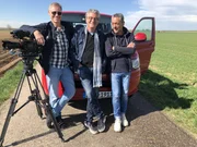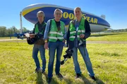 Zeppelin-Werft Friedrichshafen. Das Gernstl-Team (von links: Tonmann Stefan Ravasz, Reporter Franz Xaver Gernstl und Kameramann HP Fischer) kurz vor dem Abheben.Bild: © BR/megaherz gmbh/HP Fischer
