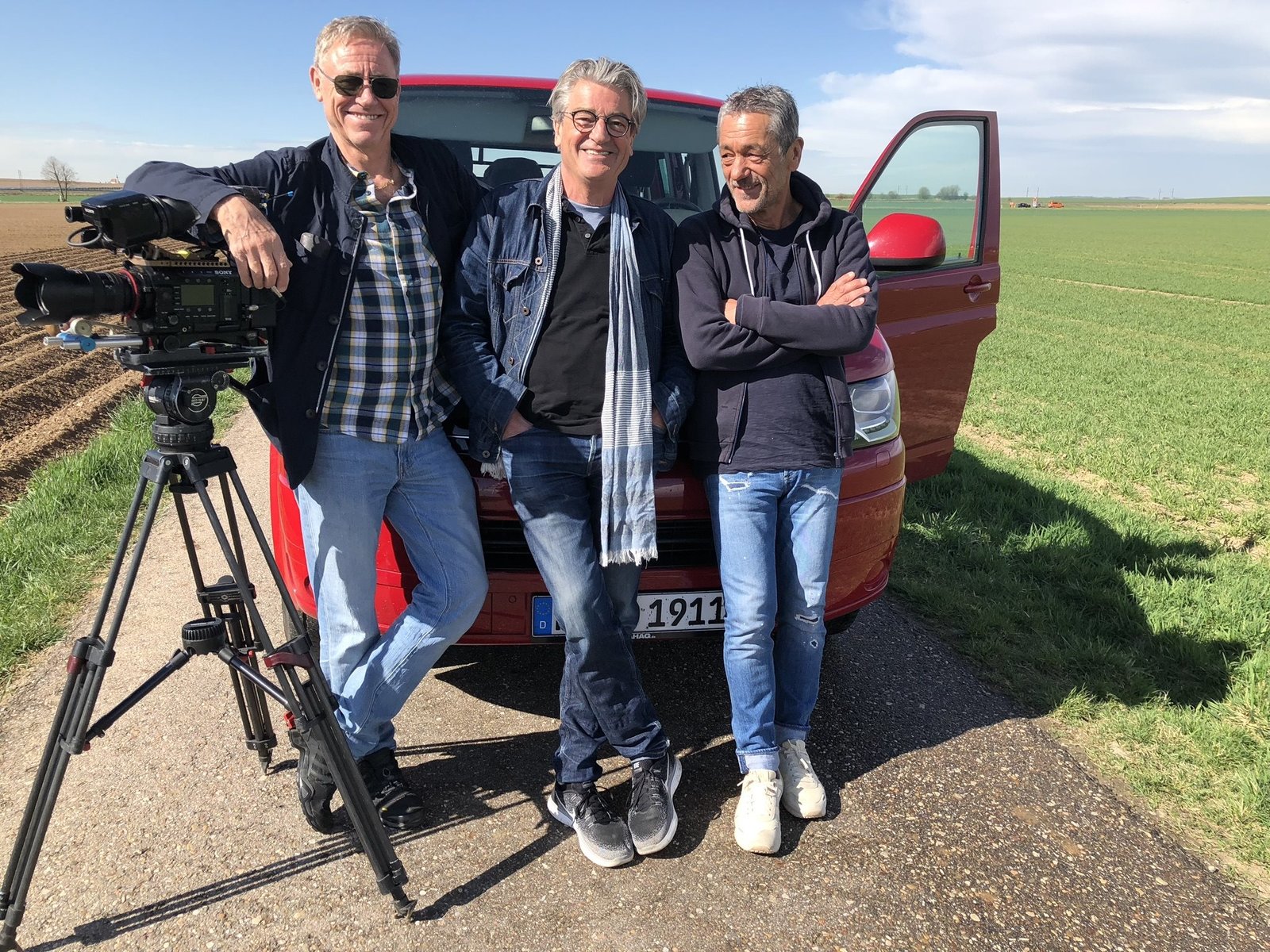 Wieder unterwegs: drei Freunde und ein roter Bus. Von links: Kameramann HP Fischer, Reporter Franz Gernstl und Tonmann Stefan Ravazs.Bild: © BR/megaherz gmbh