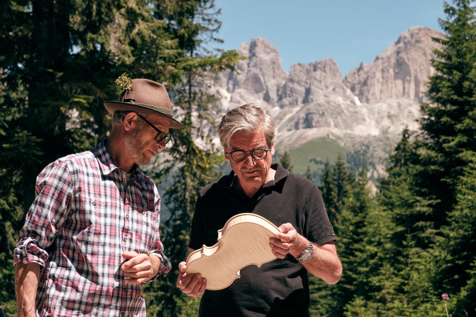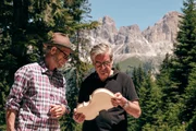 Geigenbauer Paul Lijsen (links) ist immer auf der Suche nach dem perfekten Tonholz - hier im Latemar-Wald am Fuße der Dolomiten. Rechts: Franz Xaver Gernstl.Bild: © BR/megaherz gmbh/HP Fischer