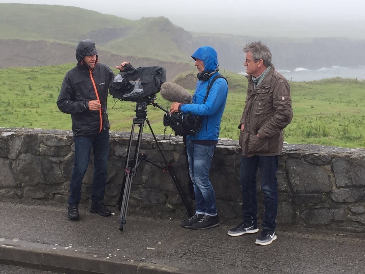 Ob es wirklich eine gute Idee war hier zu drehen? Wegen des Wetters jedenfalls muss man nicht nach Irland. Von links: Kameramann HP Fischer, Tonmann Stefan Ravazs und Reporter Franz Gernstl.Bild: © -