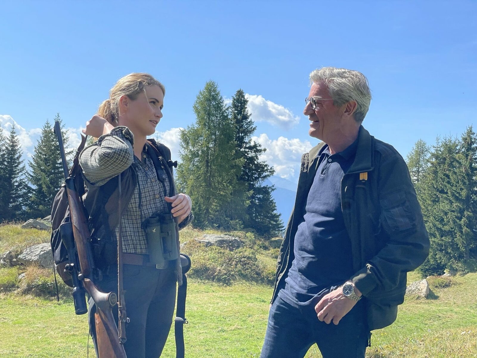Auf der Bettmeralp im Wallis: Franz Xaver Gernstl auf der Pirsch mit Jägerin Kerstin Kummer.Bild: © HP Fischer / BR, megaherz gmbh / BR/megaherz gmbh/HP Fischer