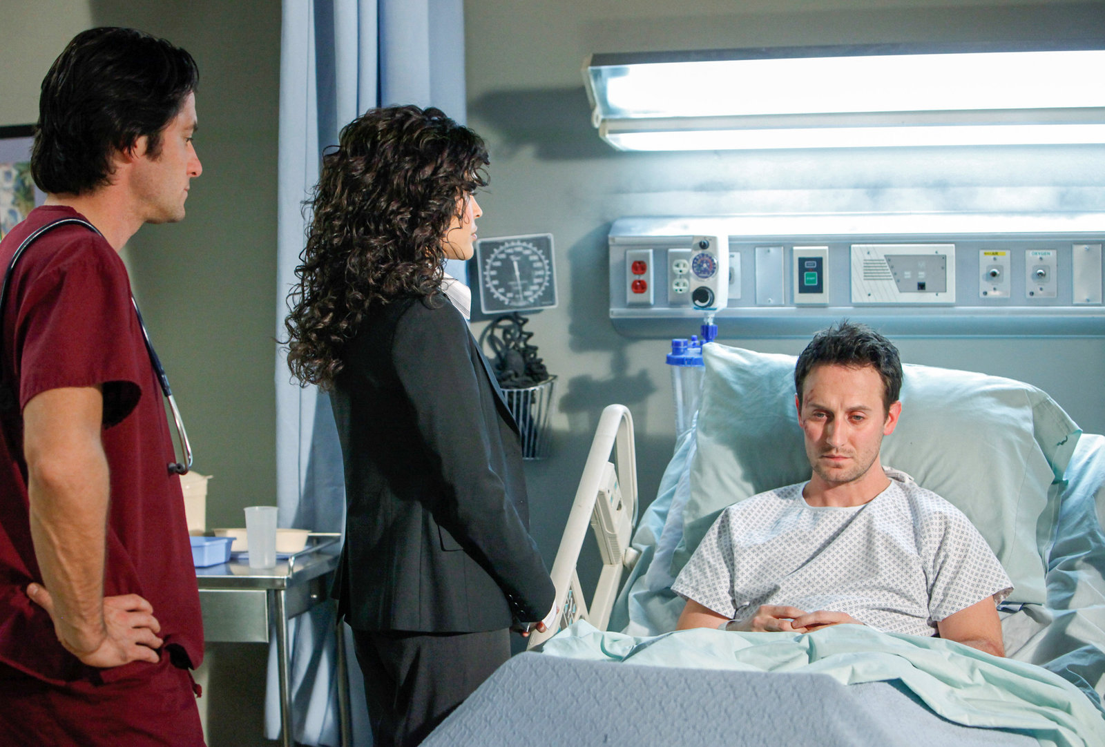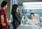 Insomnia"Ghost Whisperer", "Insomnia." Während Jims Dienst im Krankenhaus, wird ein blutverschmierter Mann namens Robert eingeliefert, der behauptet, ein mysteriöser Verfolger wolle ihn töten. Zunächst deutet alles darauf hin, dass der Mann an einer Psychose leidet. Doch Melinda vermutet etwas anderes. In einer Vision sieht sie, dass Robert selbst eine Frau mit dem Messer verletzt hat.Im Bild (v.li.): David Conrad (Jim Clancy), Ion Overman (Det. Sam Blair), Josh Stewart (Robert Wharton).Bild: © ORF