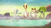 Tinys TriumphAls der Vulkan ausbricht, sind Rocky, Mazu, Bill und Tiny (v.l.n.r.) von Lava umzingelt. Auf einem Felsen finden sie Schutz.Bild: © ORF 1