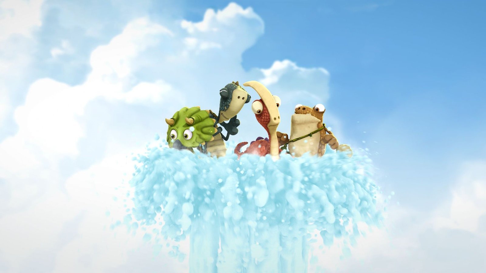 Die BlumenschleuderTiny, Bill, Rocky und Mazu (v.l.n.r.) entdecken eine Fontäne, die sie nutzen wollen, um Giganto von den Stinkblumen zu befreien.Bild: © SUPER RTL