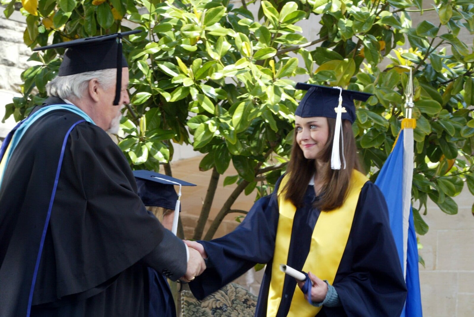 Ein starker AbgangAls ihr Schulleiter Charleston (Dakin Matthews, l.) das Zeugnis überreicht, ahnt Rory (Alexis Bledel, r.) noch nicht, dass ihre Mutter bald nicht nur ohne Job dastehen wird, sondern auch ihren Traum aufgeben muss ...Bild: © 2002 Warner Bros. Lizenzbild frei