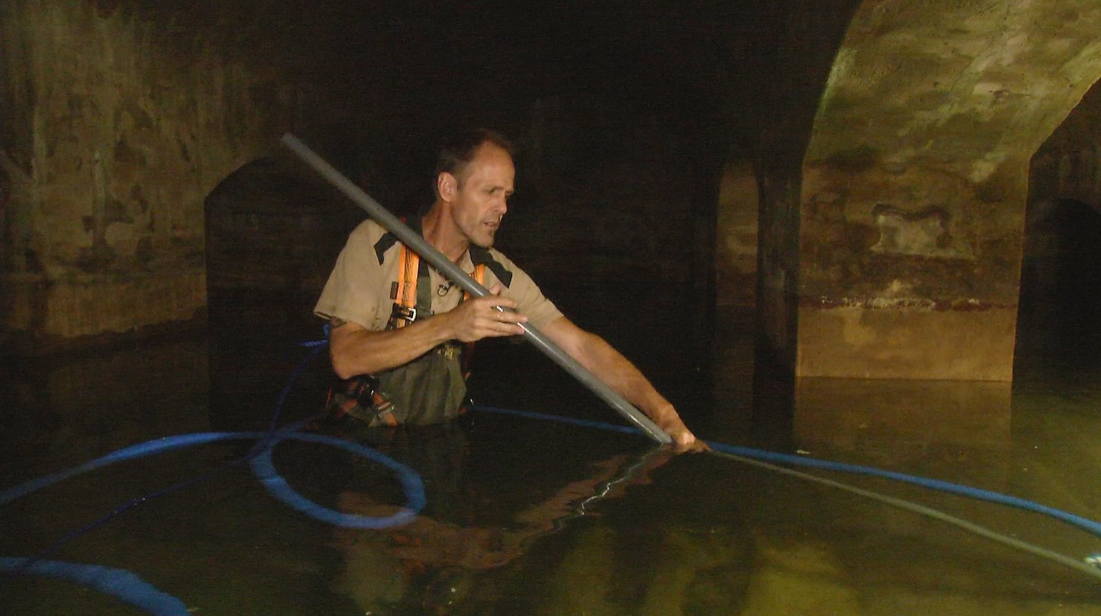 Reinemachen in den Zoo-KatakombenThomas Hüge reinigt die Zisterne unter dem Exotarium des Frankfurter Zoos.Bild: © HR
