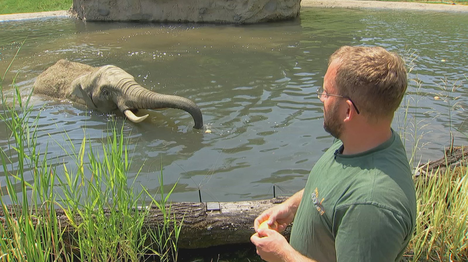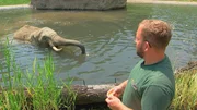 Köpfchen in das Wasser, Rüssel in die Höh'Elefantenbulle Tamo aus dem Opel-Zoo plantscht im kühlen Nass. Pfleger Marcel König ist glücklich.Bild: © HR
