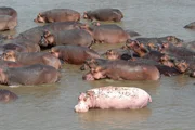 Ein Flusspferd wird 50Einer afrikanischen Legende zufolge sandte der Schöpfer einst Boten in Tiergestalt zur Erde - und tut dies bis heute. Diese "Götterboten" fallen durch eine ungewohnte Färbung auf: Ein weißer Löwe, ein gelbes Krokodil und ein weißer Pavian sind die Hauptdarsteller in diesem außergewöhnlichen Tierporträt. Dazu gesellen sich ein rosafarbenes Flusspferd, ein schwarzer Leopard und ein gestreifter Gepard. Diese Launen der Natur sind für die betroffenen Tiere unangenehm, ja mitunter sogar gefährlich: Da sie sich von der Umgebung wie von ihren Artgenossen deutlich abheben, geraten sie eher ins Visier von Feinden und Räubern, oder können sich - wie im Fall des weißen Löwen - nur schwer unbemerkt an Beute anpirschen. Im Bild: rosa Flusspferd.Bild: © ORF/OFF THE FENCE/Aquavision