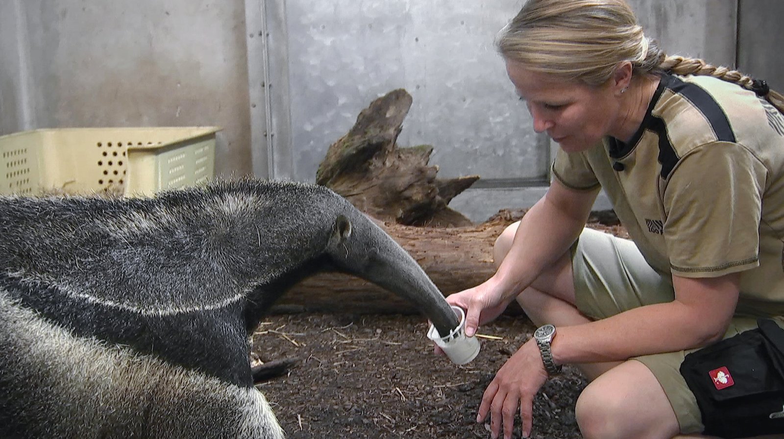 Auge in Auge mit Giraffe GregorDr. Nicole Schauerte ist total fasziniert von den neuen Ameisenbären im Frankfurter Zoo.Bild: © HR