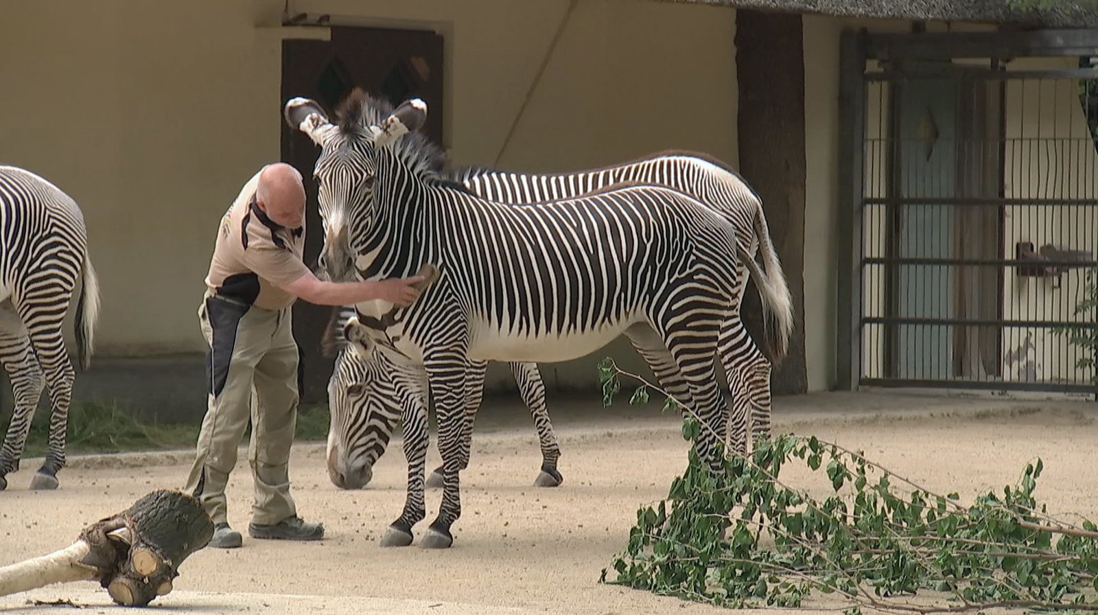 Bunt, bunter, Chamäleon: Ein Fundtier erobert die HerzenZebra Nike aus dem Frankfurter Zoo hat scheinbar nichts gegen eine Schrubbeinheit von Pfleger Walter Arlt.Bild: © HR