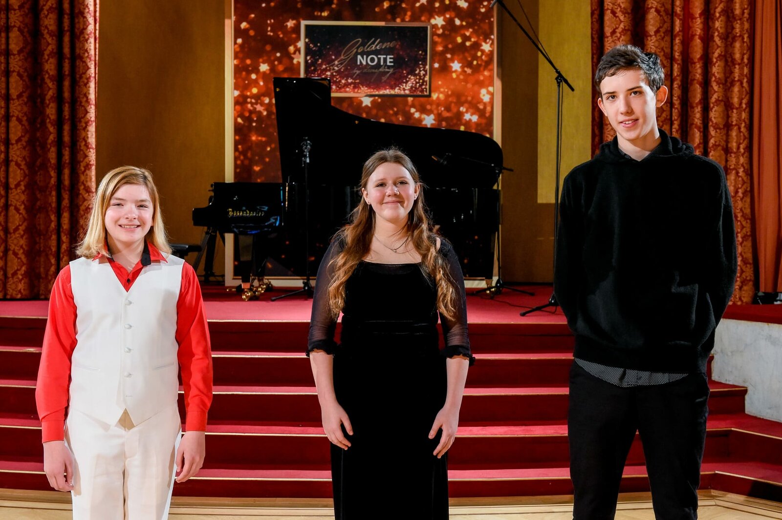 die Finalisten am Klavier: Elias Keller, Madeleine Hogg, Max Weller.Bild: © ORF/Thomas Jantzen