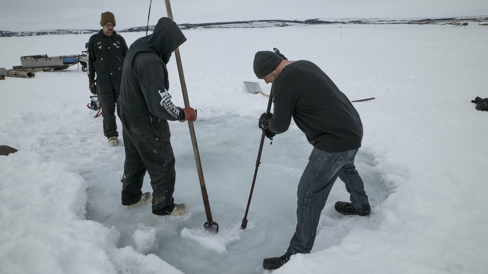 Der ProzessZeke and Glen on ice prepare to drill.Bild: © Discovery Communications