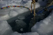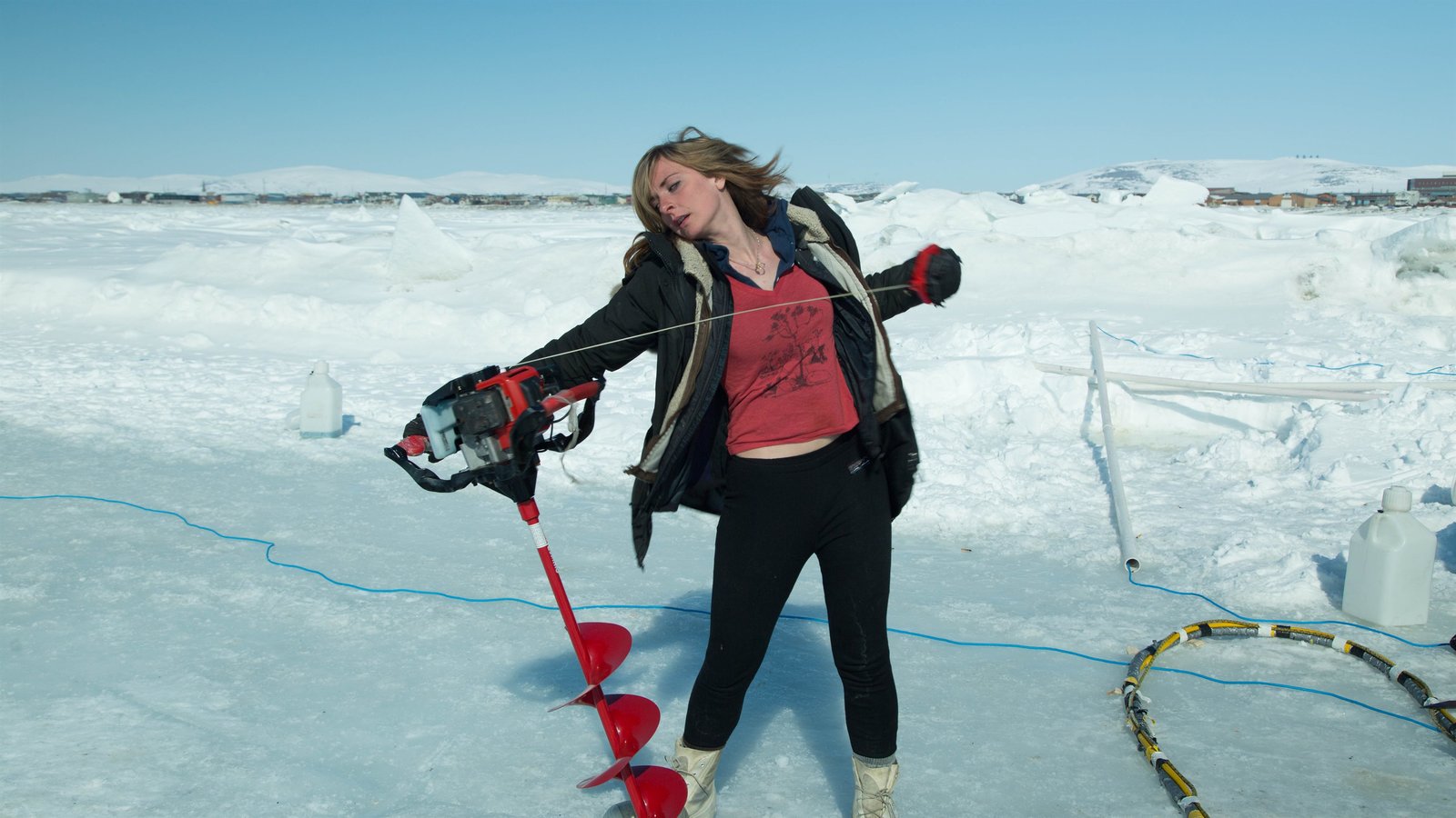 Letzte Chance auf GoldEmily Riedel pulling the cord on an ice auger.Bild: © Discovery Communications