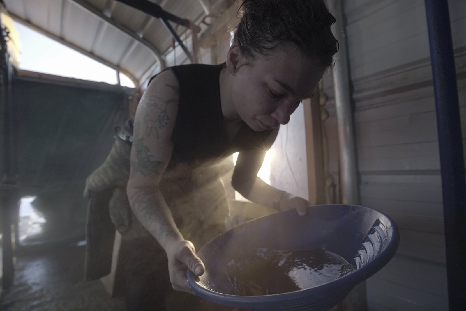 Rettung in letzter SekundeJenny Panos pans for gold in the light of a low sun.Bild: © Discovery Channel