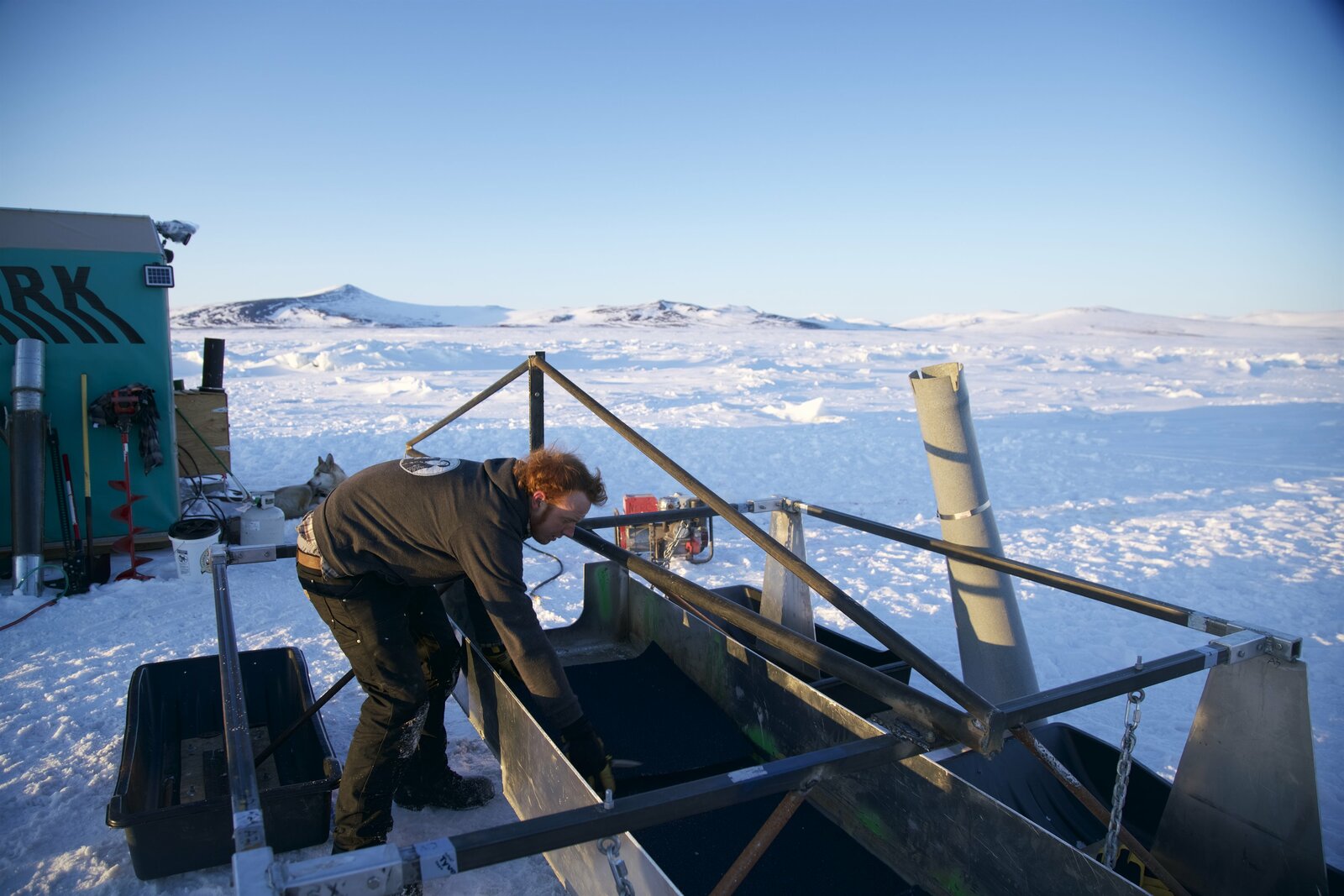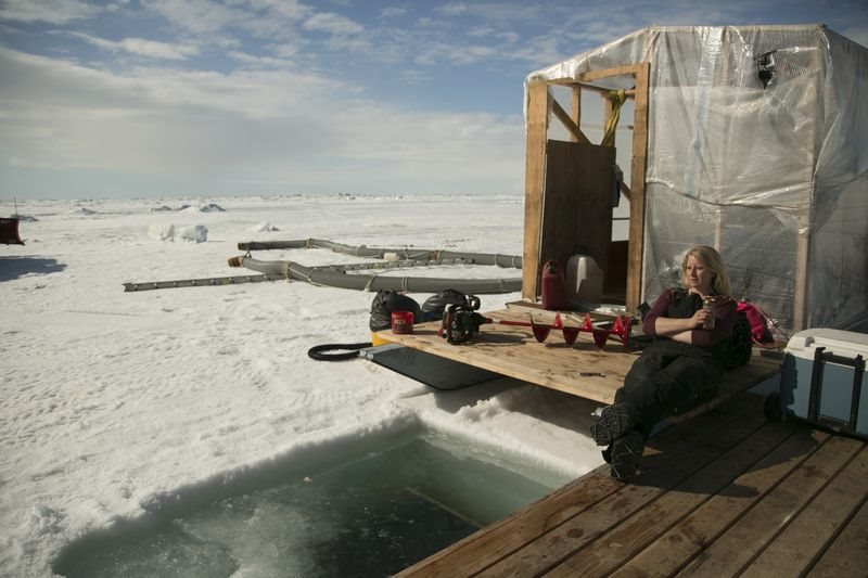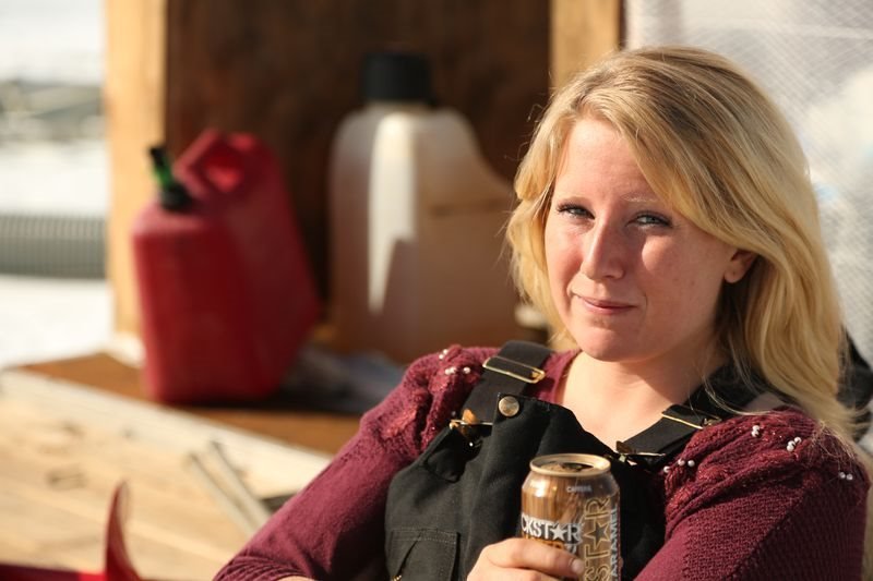 MotorschadenEmily Riedel kneeling on a dredge.Bild: © Nicholas Bunker / Discovery Channel / Discovery Communications