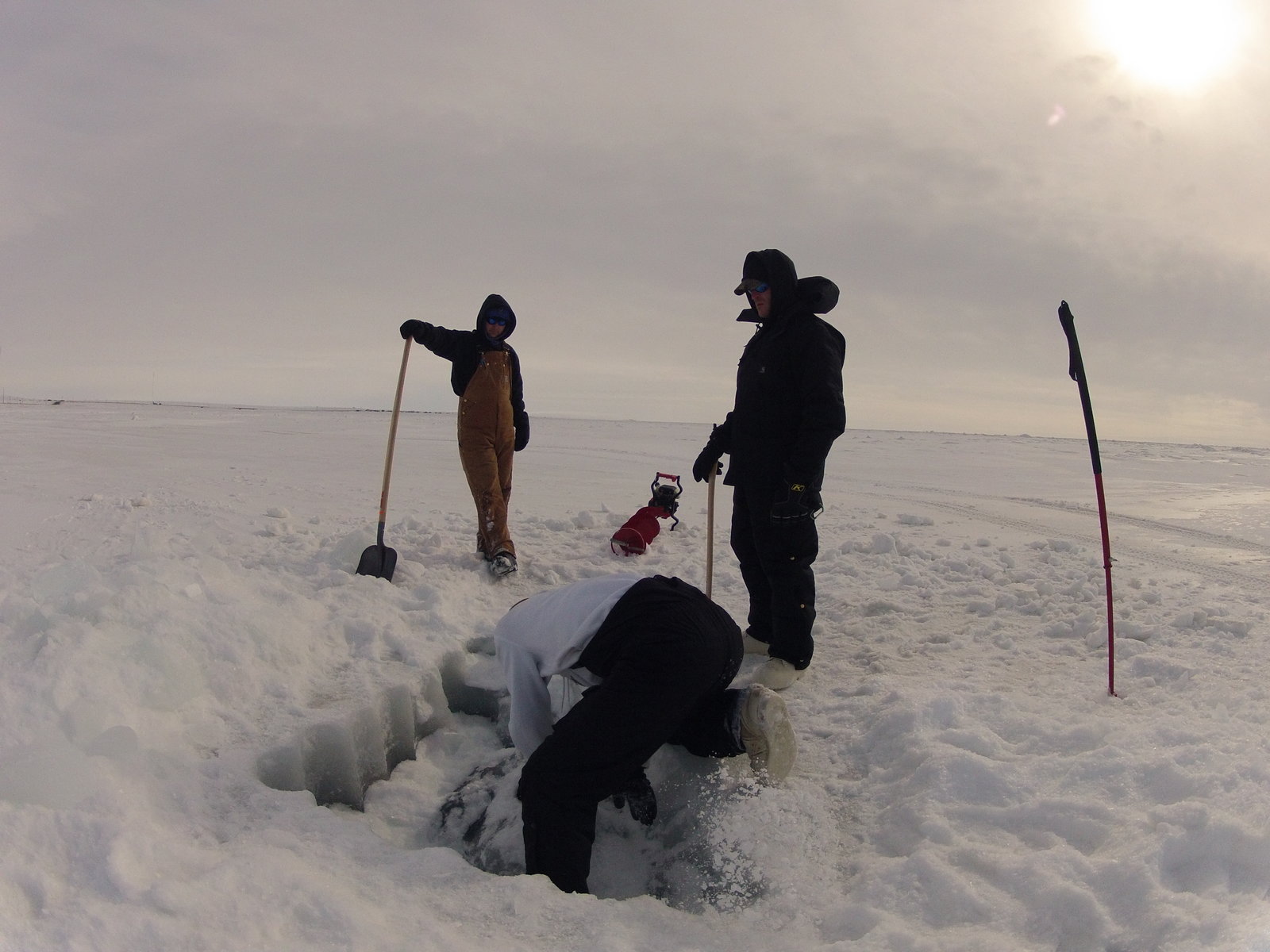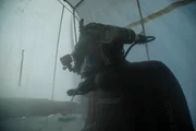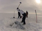 Ein Ass im ÄrmelShawn Pomrenke is suited up and sitting down at his ice hole ready to dive.Bild: © Discovery Channel / Discovery Communications