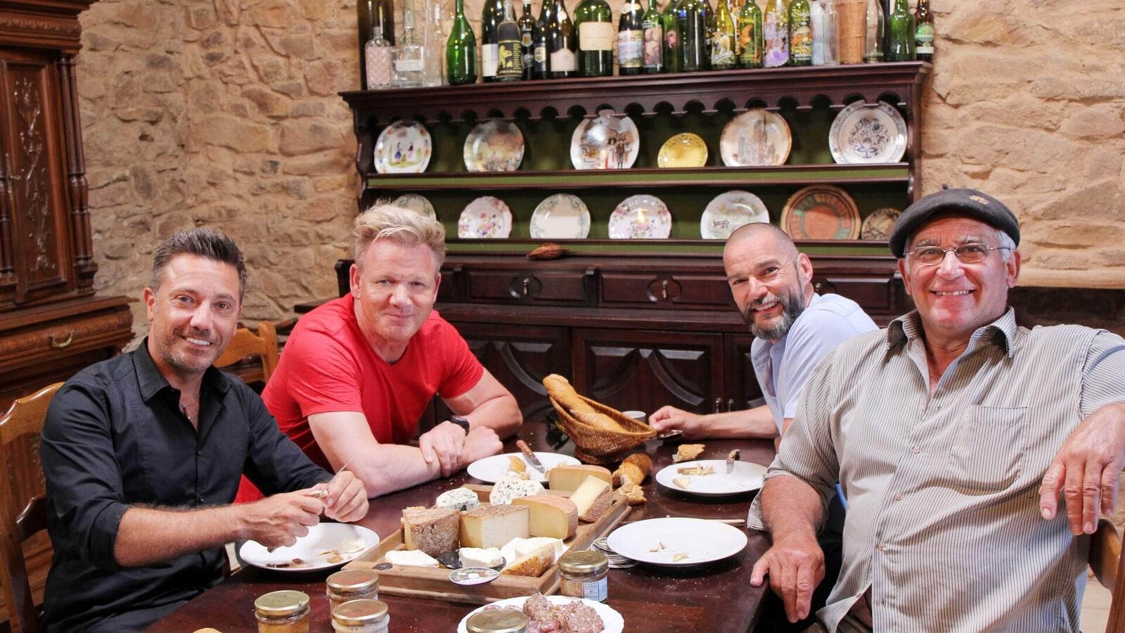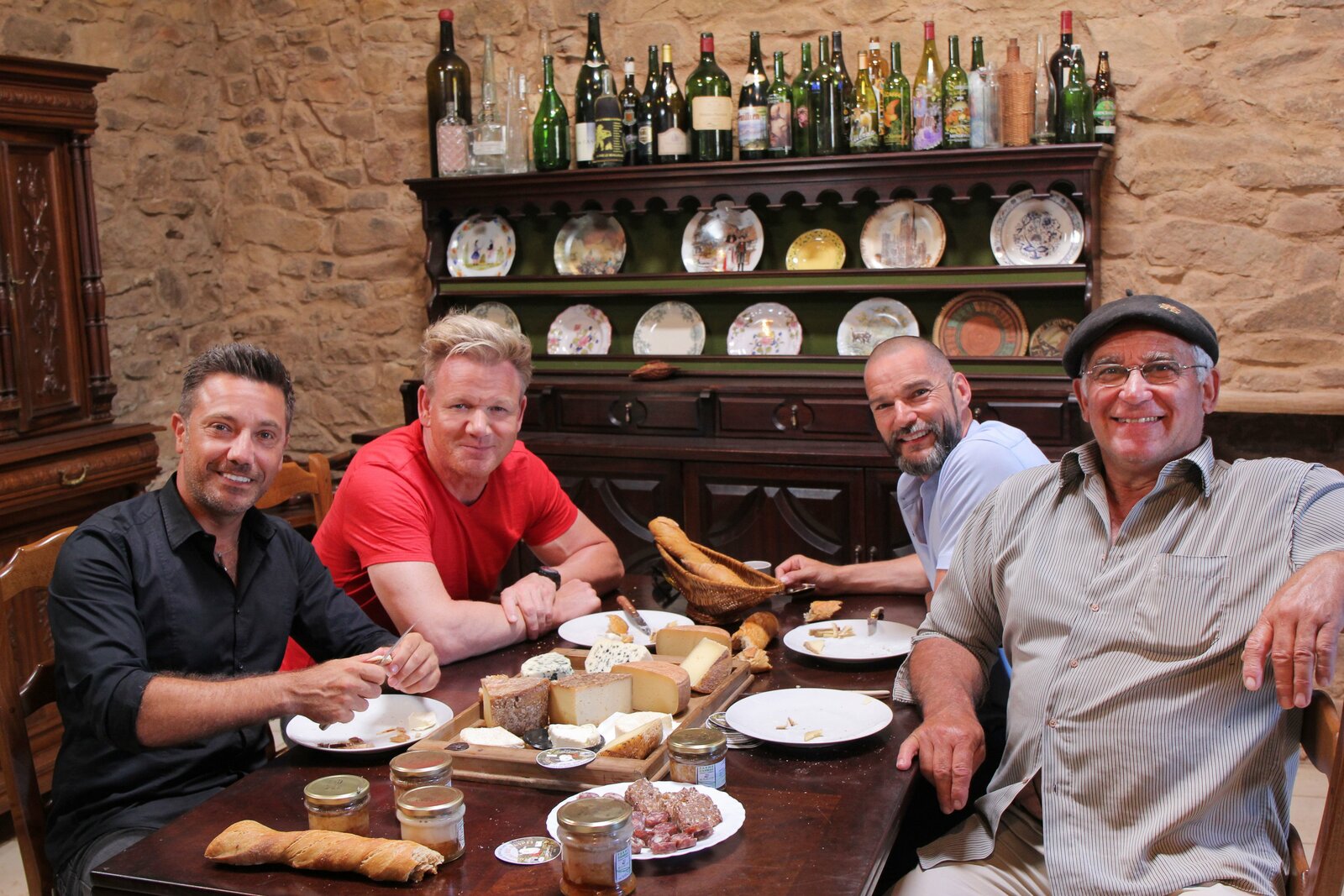 Die Frankreich-ConnectionVon links: Gino D'Acampo, Gordon Ramsay und Fred Sirieix probieren Käse mit Jean Claude, Besitzer einer preisgekrönten handwerklichen Käserei.Bild: © RTL/ © ITV