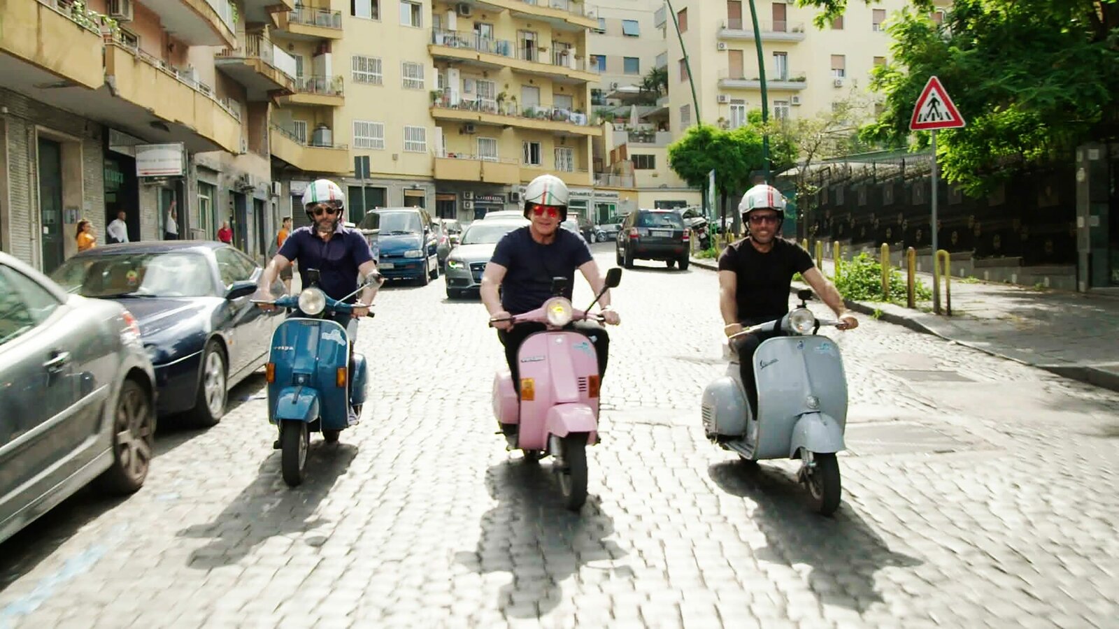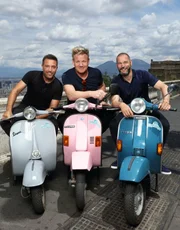 Ein italienischer JobVon links: Fred Sirieix, Gordon Ramsay und Gino D'Acampo sind mit Mopeds auf den Straße von Neapel unterwegs.Bild: © The Italian Job /