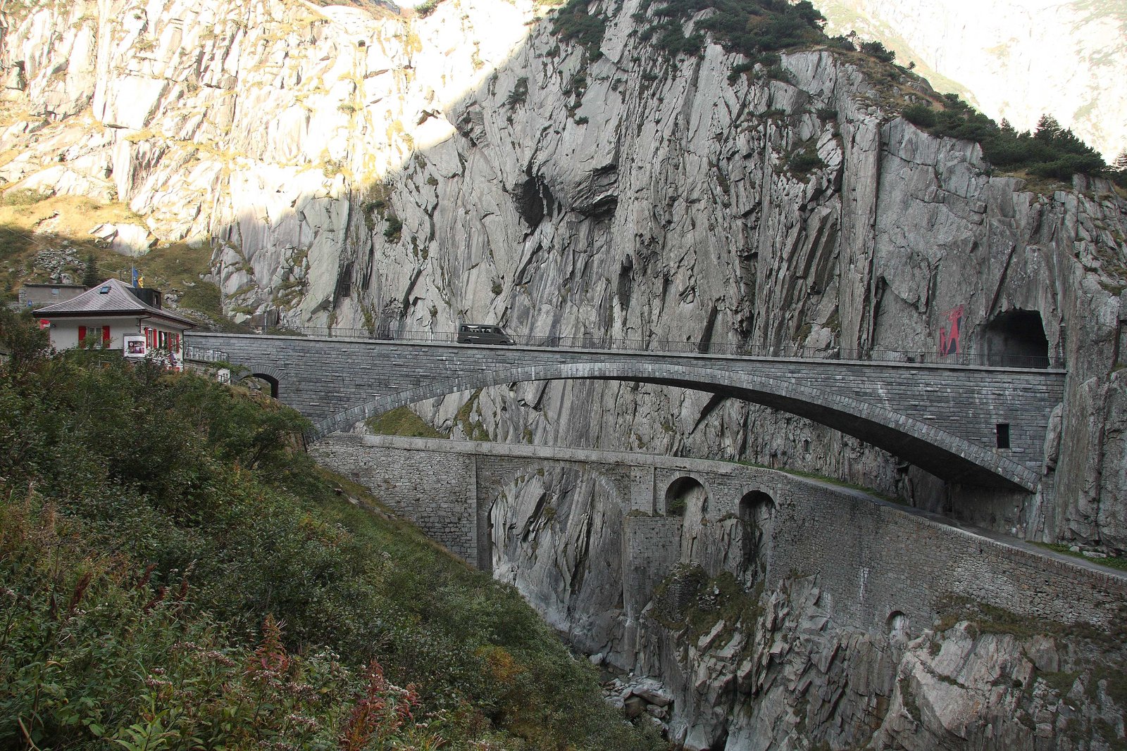 Die Teufelsbrücke überwindet die tiefe Schöllenenschlucht, das größte Hindernis am Gotthard. Bis zum 17. Jahrhundert war es nur unter erschwerten Bedingungen möglich, hier durchzukommen und Handelswaren zwischen dem Norden und dem Süden zu transportieren.Bild: © ZDF und Michael Petsch