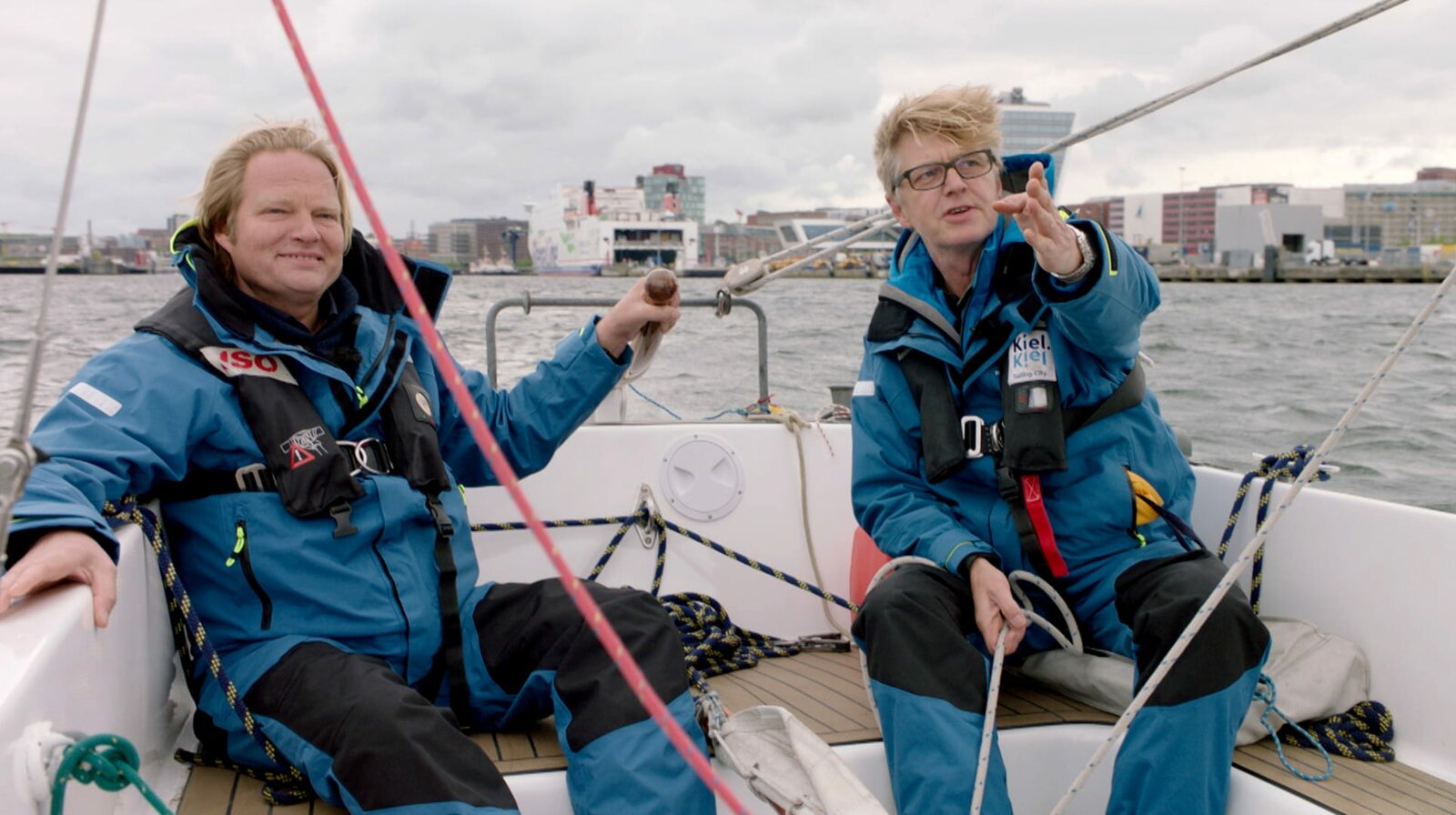 Kiel und die FördeBjörn Freitag (l) mit Segeltrainer Hanno Genz auf Seegelstadtrundfahrt.Bild: © WDR/2bild GmbH/Kinga Janur