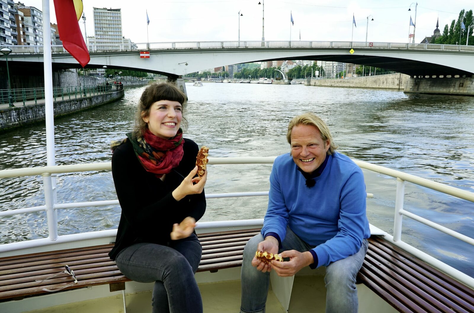 Lüttich - wallonische Stadt an der MaasBjörn Freitag (r) und Jenny Rode auf der Fähre mit belgischen Waffeln.Bild: © WDR/2bild GmbH/Sophie M. Neuer