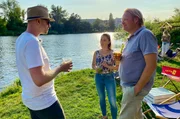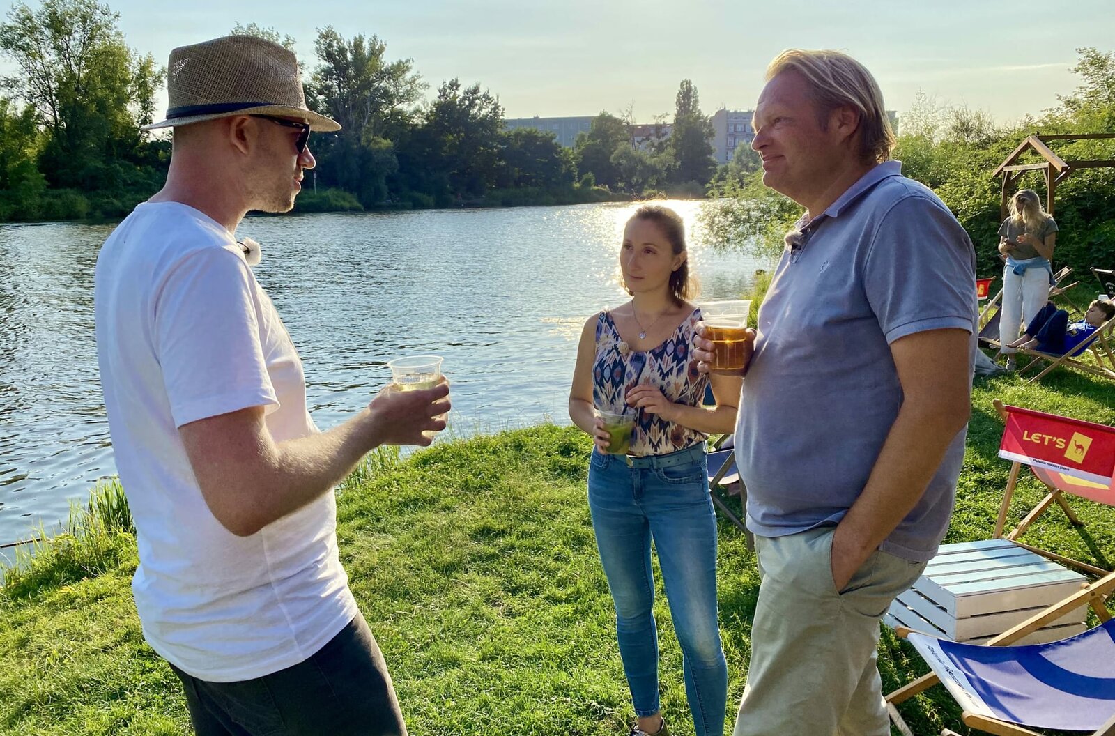 Breslau - polnische Metropole an der OderBjörn Freitag (r) mit Mirko von Wroclaw Guide und Judith (M) in der Strandbar Forma Plynna.Bild: © WDR/2Bild GmbH/Sven Görn