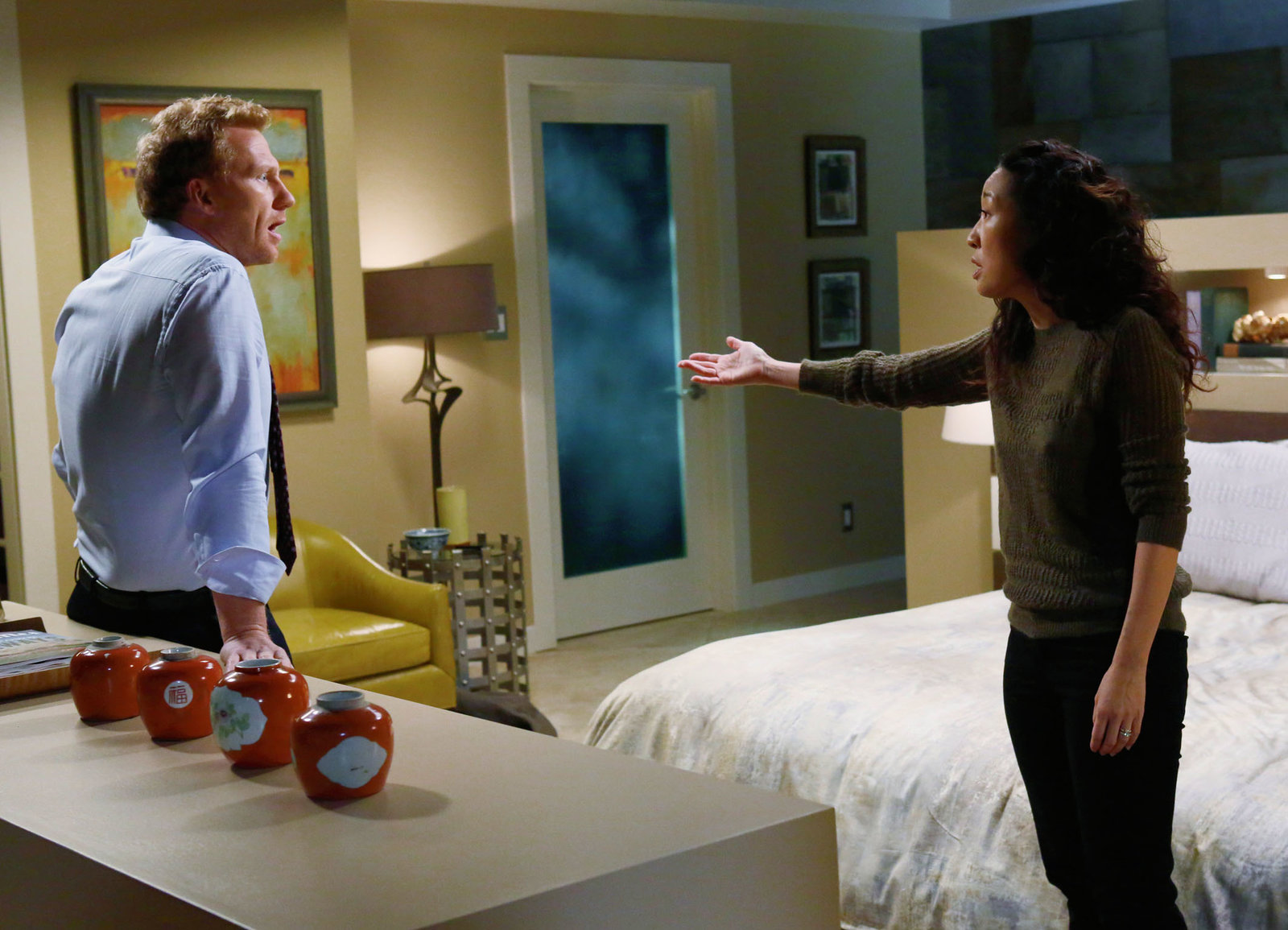 Weißt du, wer du bist?Unterschiedliche Zukunftspläne: Kevin McKidd als Owen Hunt, Sandra Oh als Cristina YangBild: © SRF/ ABC Studios